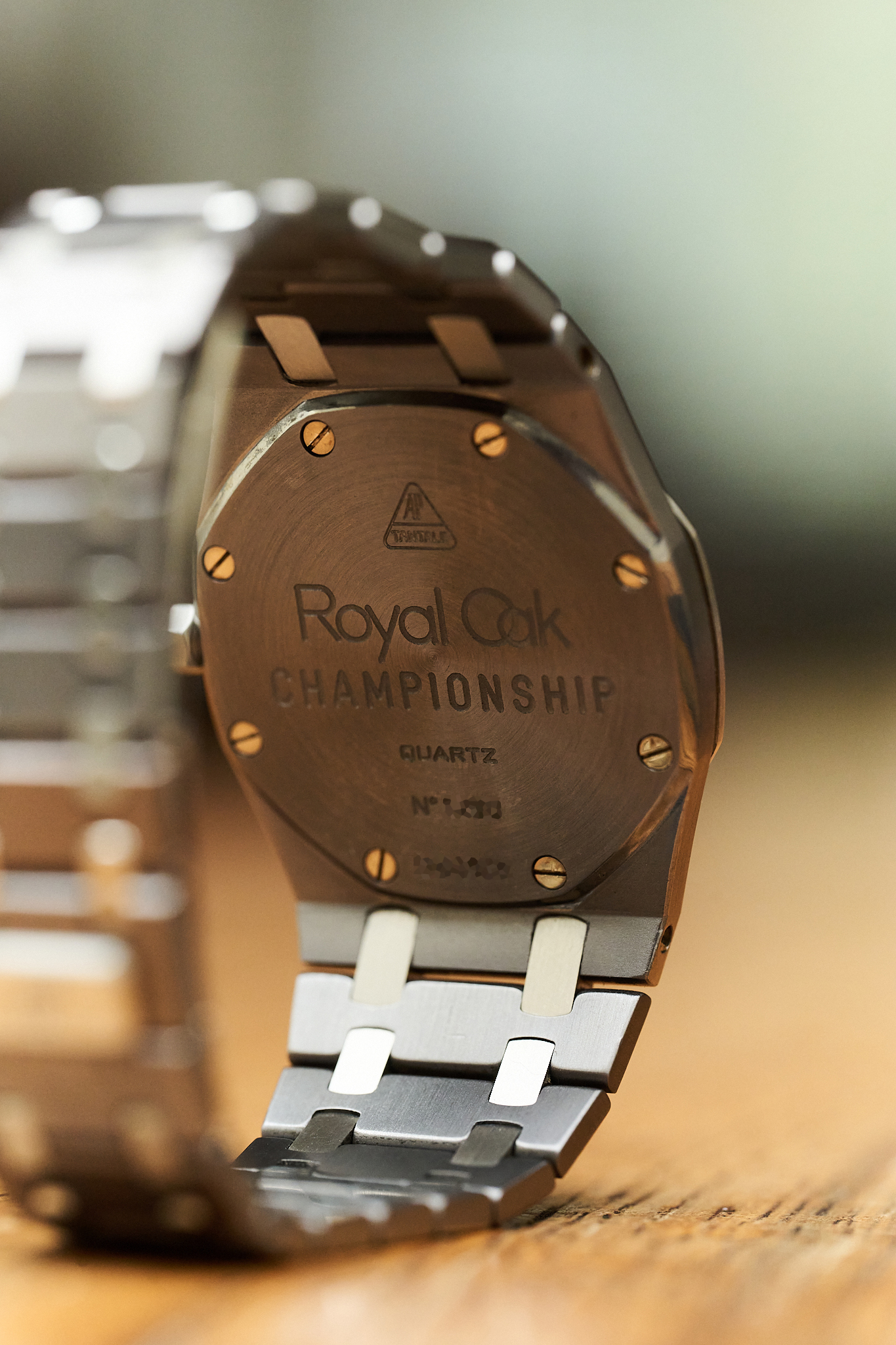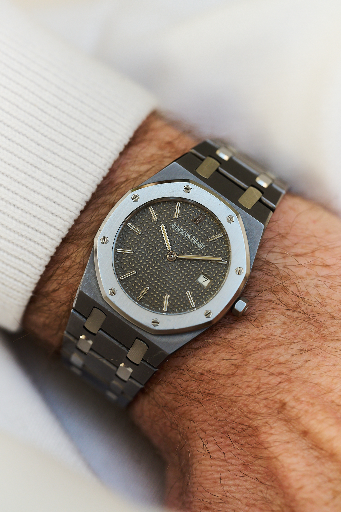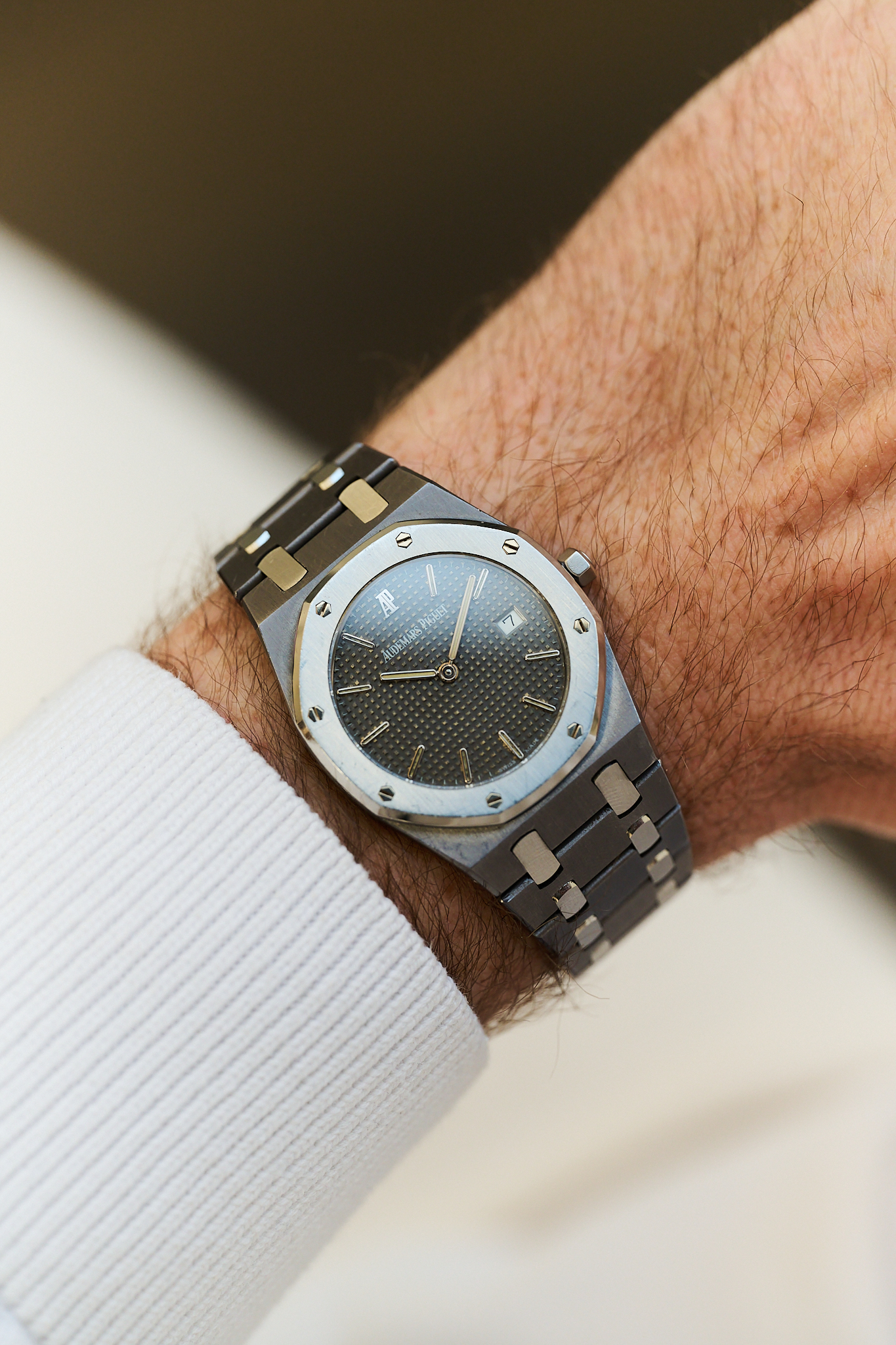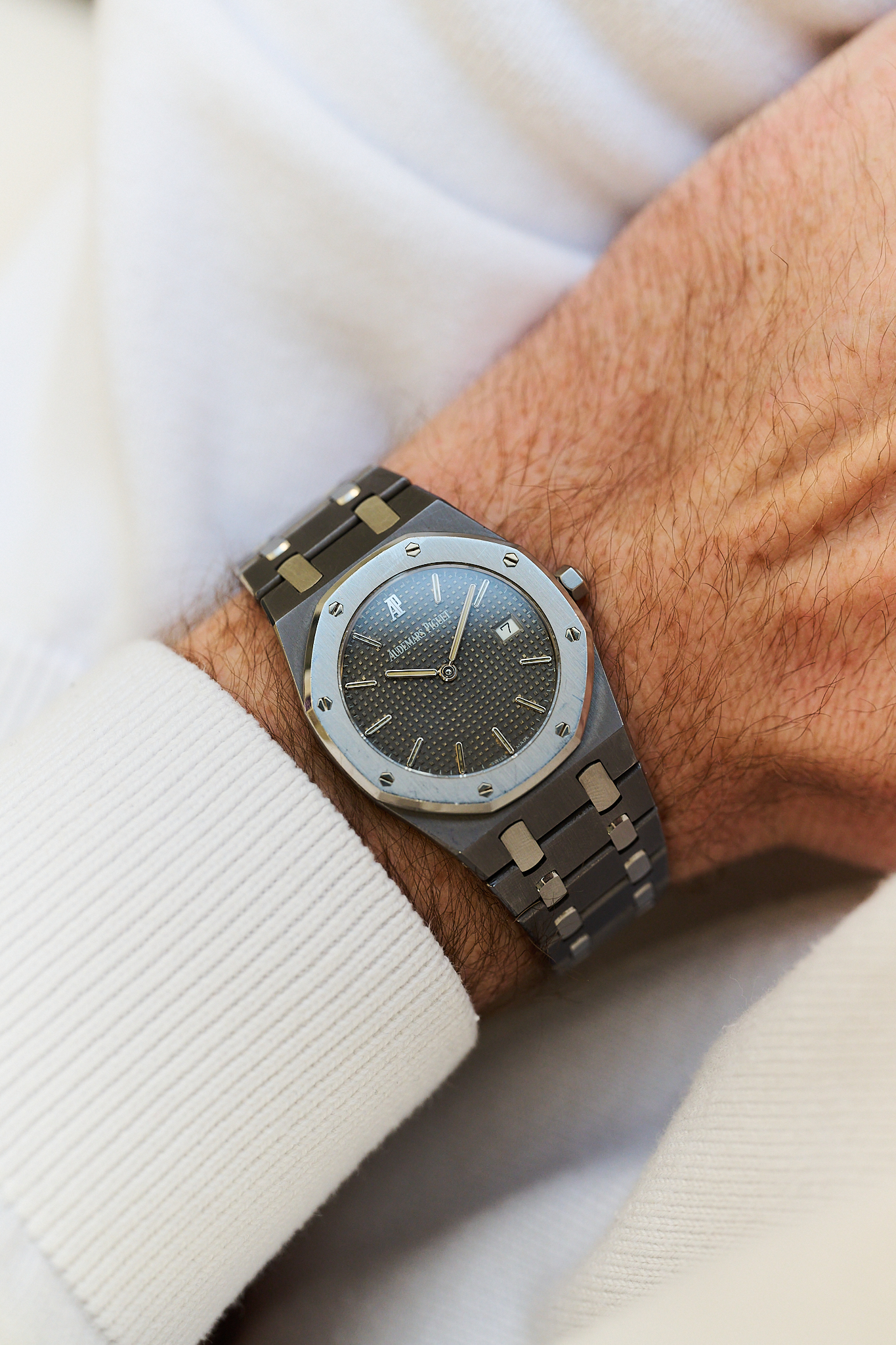 Introduced in the early 1990s, the reference 56175TT is celebrated for its unusual two-metal construction, with the darker tantalum centre case and bracelet giving the watch a rich slate-grey tone and satisfying weight on the wrist, beautifully contrasted by the stainless steel bezel and centre links. Measuring 33mm, it wears far larger than the dimensions suggest thanks to the classic Royal Oak proportions. The engraved “Championship” caseback nods to the model’s origins, released to celebrate Sir Nick Faldo’s historic back-to-back Masters victories at Augusta in 1989 and 1990.