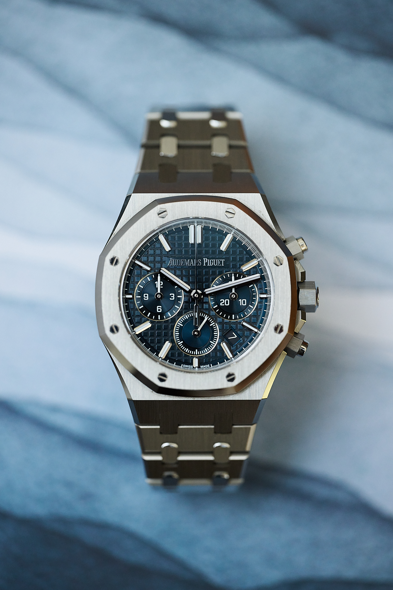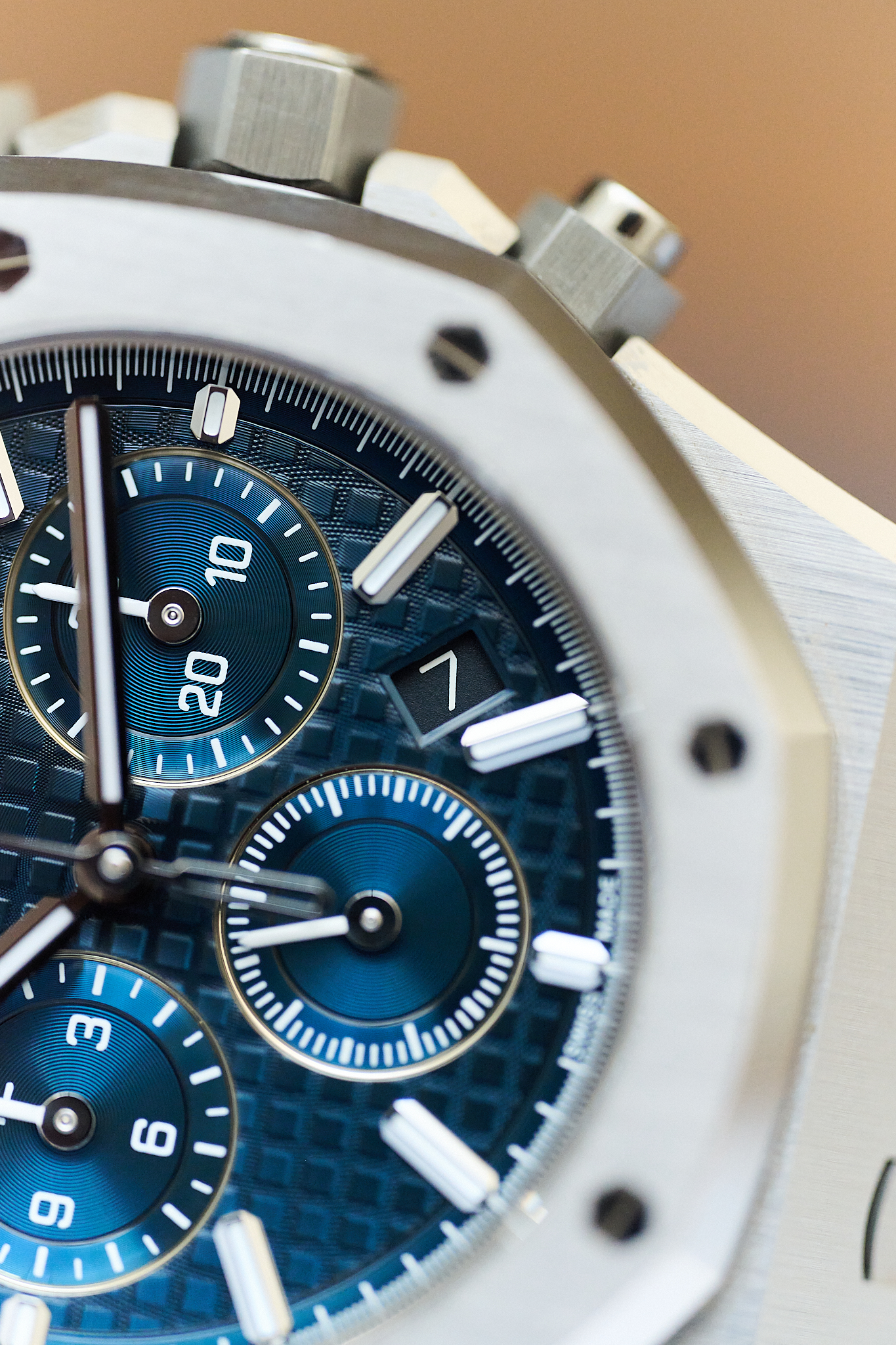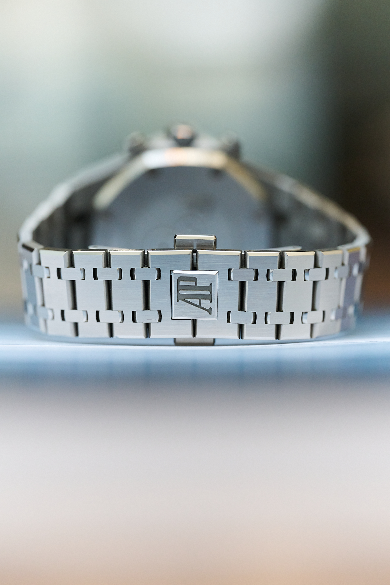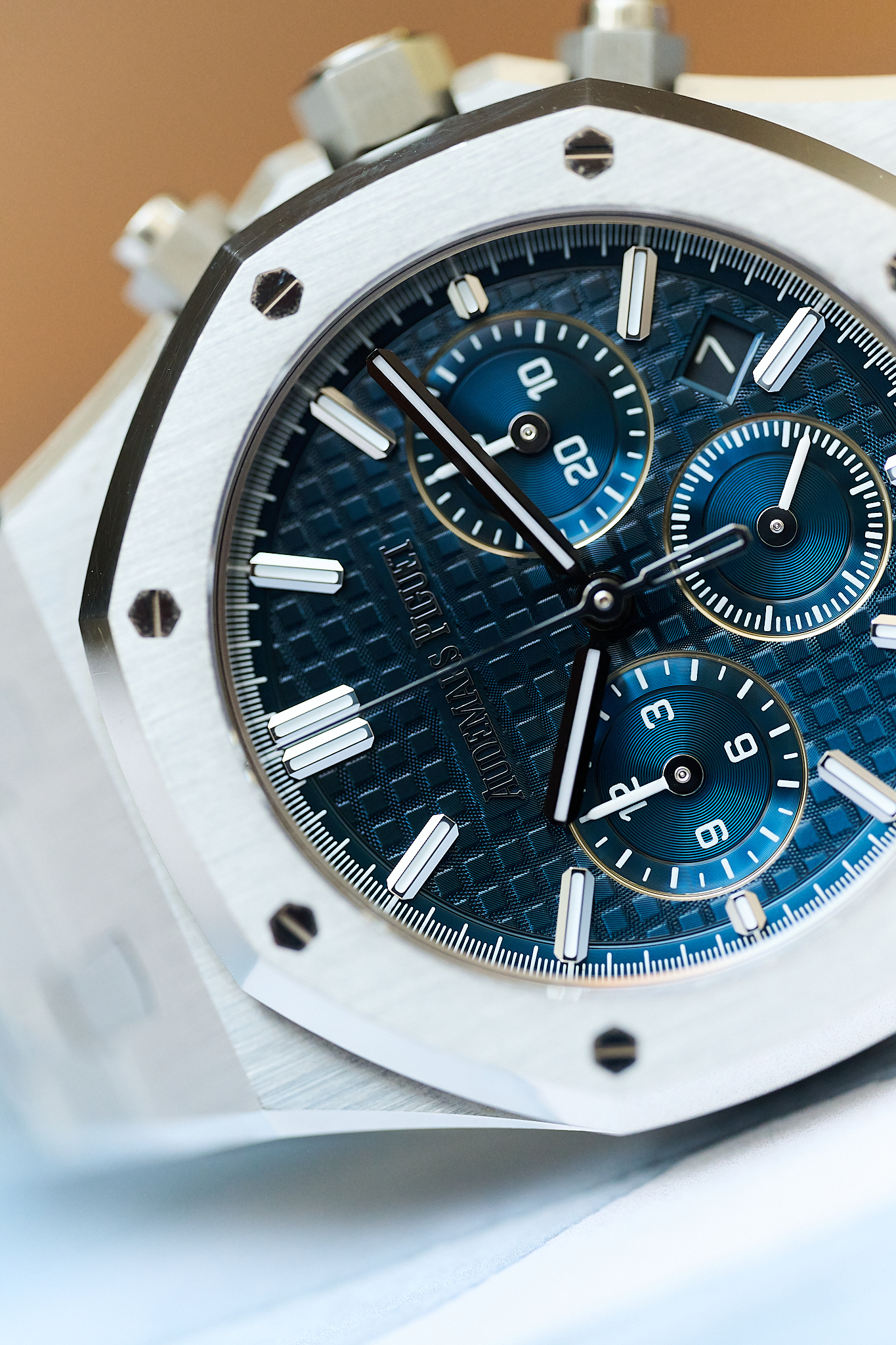 Its blue Grande Tapisserie dial is, of course, the configuration everyone wants. The hue is unmistakably tied to the original 5402: that same cool, steely blue that shifts character with the light, giving the watch both subtlety and presence. Paired with the deep texture of the tapisserie and the crisp white-gold markers, it’s the most coveted dial colour across the Royal Oak family - and particularly special in the 38mm chrono format.