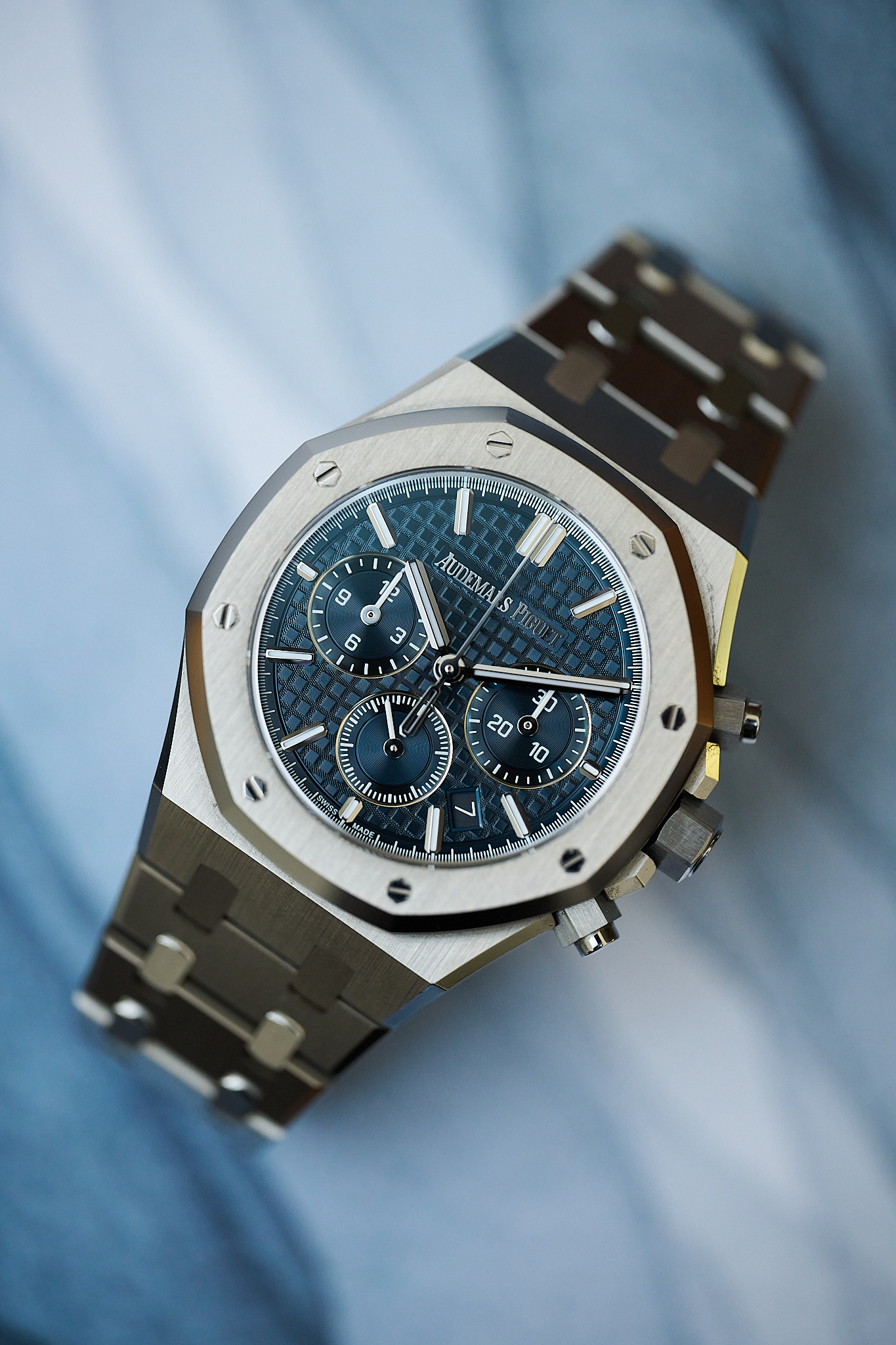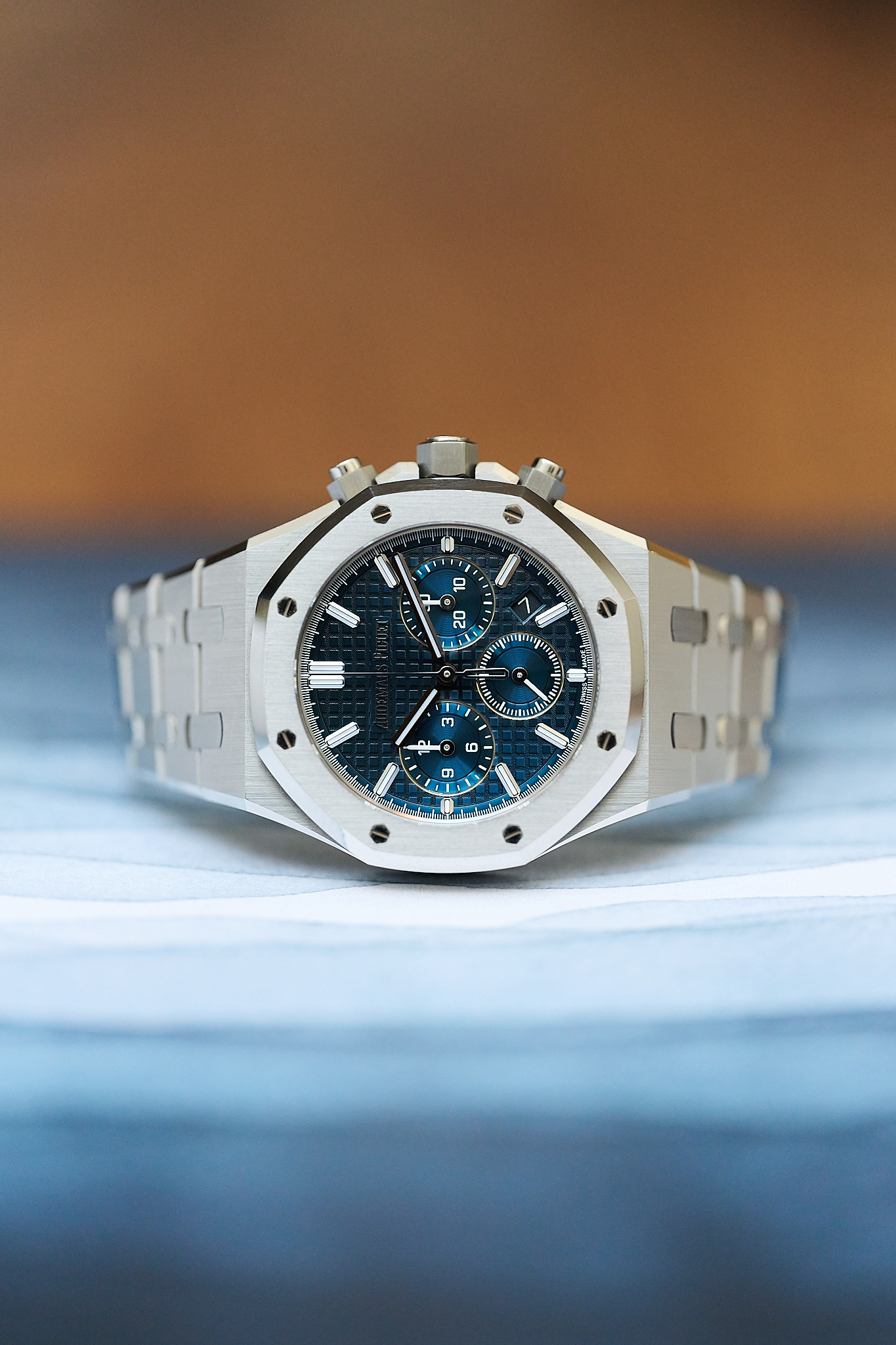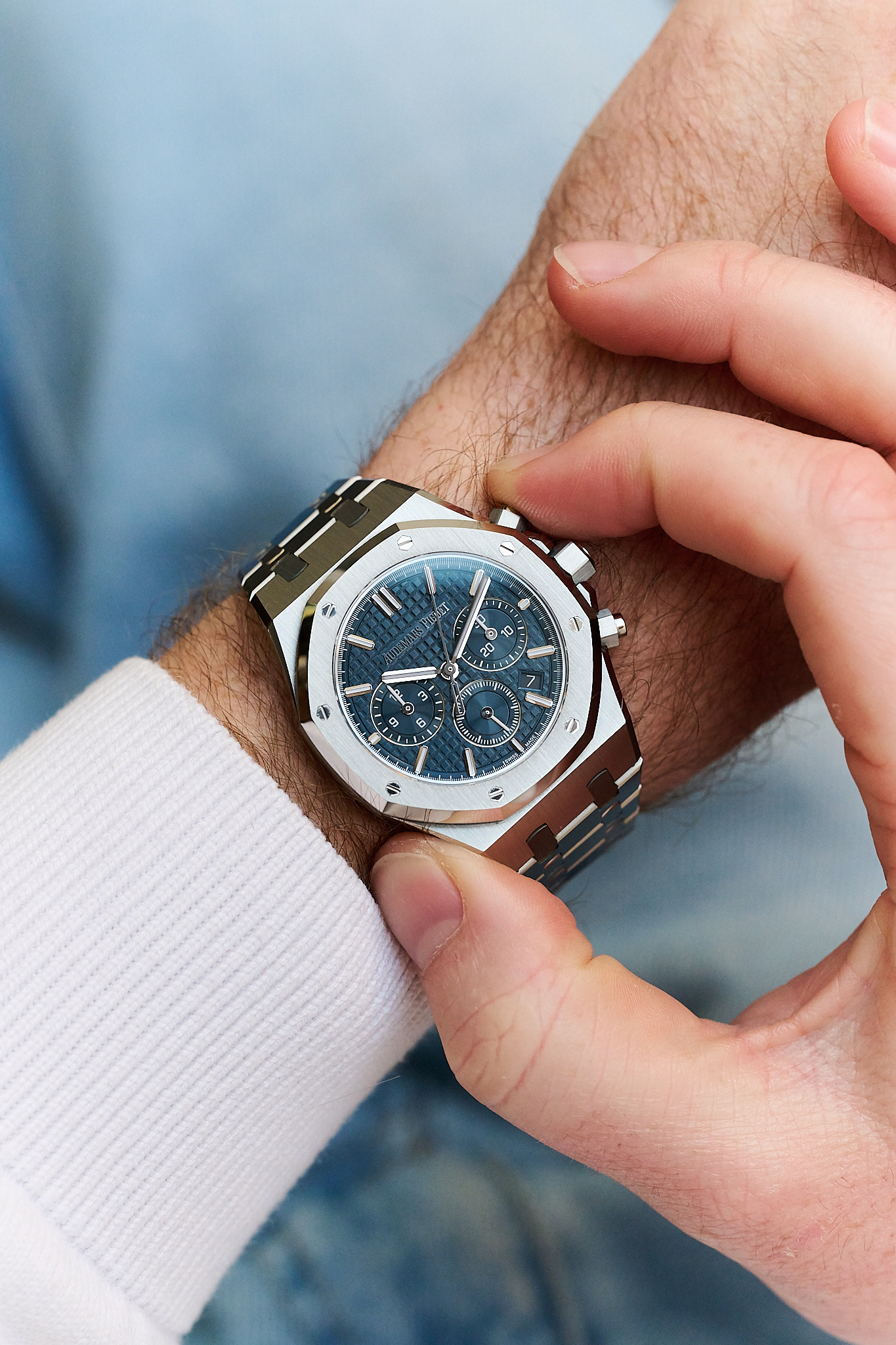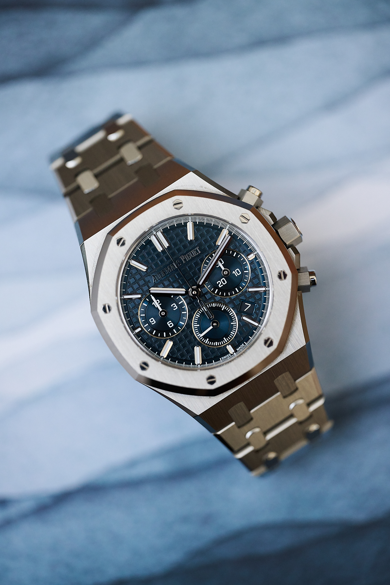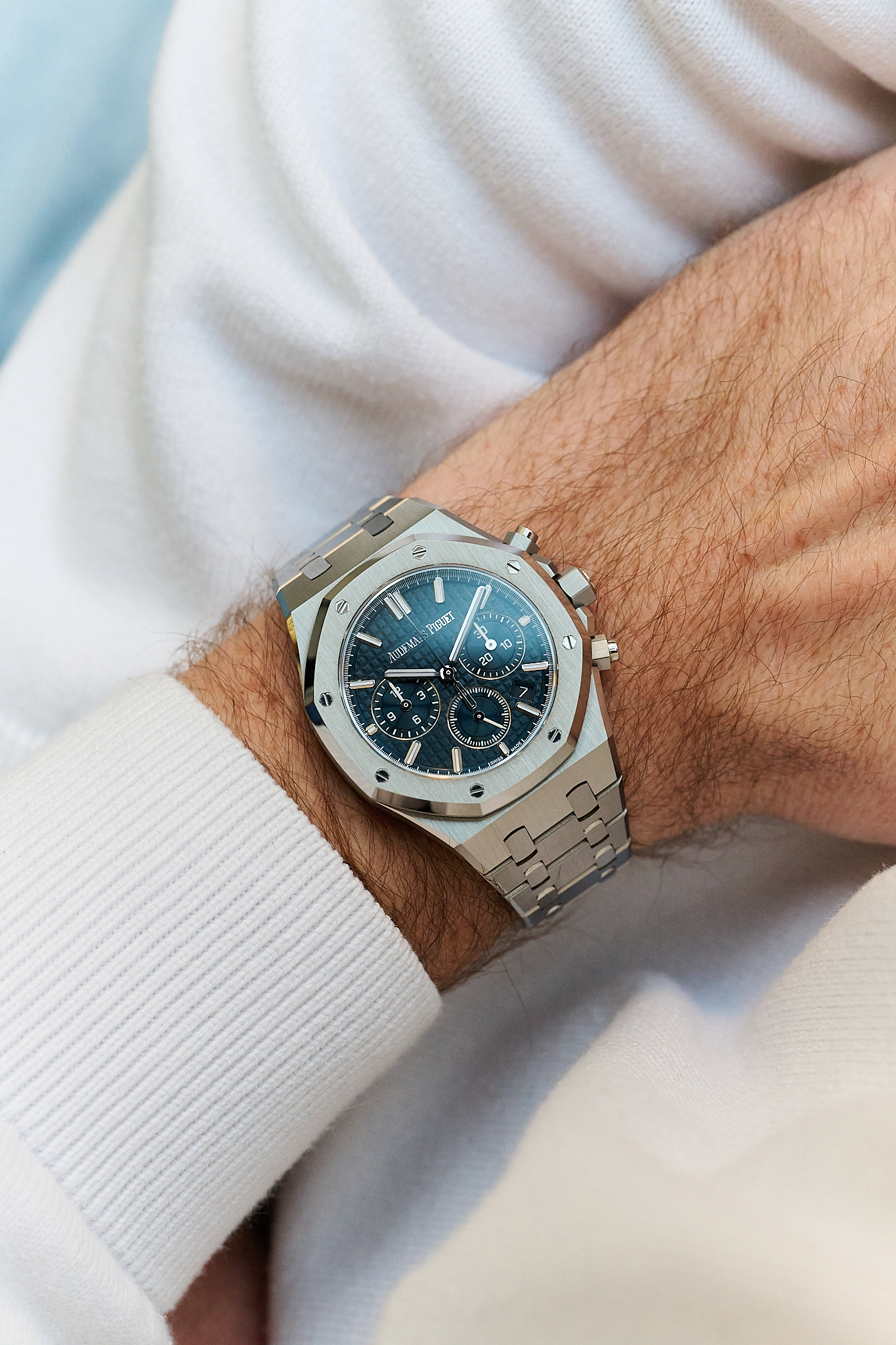 Its blue Grande Tapisserie dial is, of course, the configuration everyone wants. The hue is unmistakably tied to the original 5402: that same cool, steely blue that shifts character with the light, giving the watch both subtlety and presence. Paired with the deep texture of the tapisserie and the crisp white-gold markers, it’s the most coveted dial colour across the Royal Oak family - and particularly special in the 38mm chrono format.