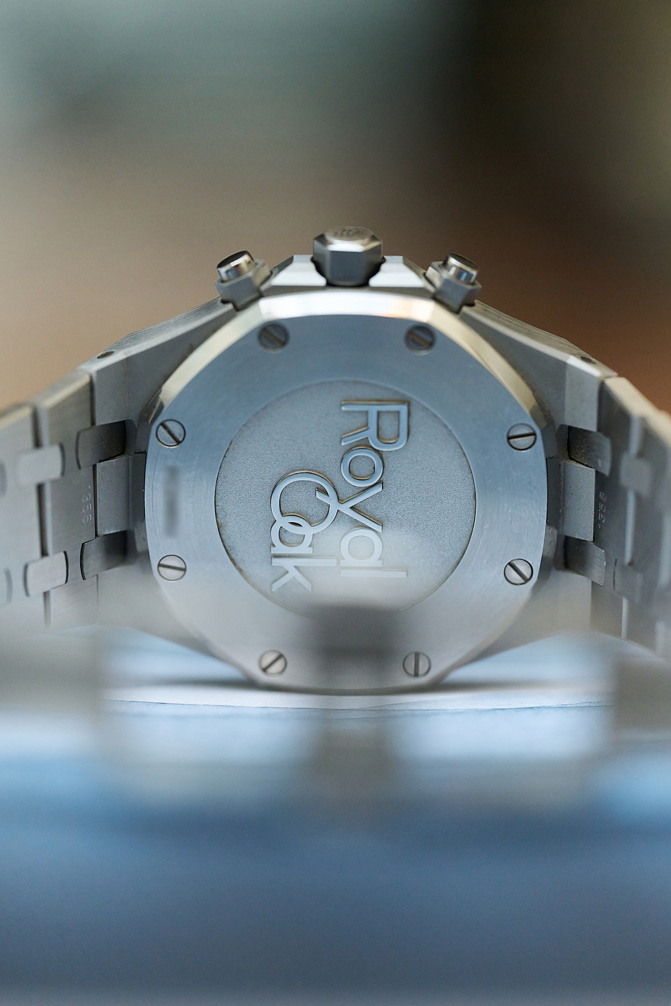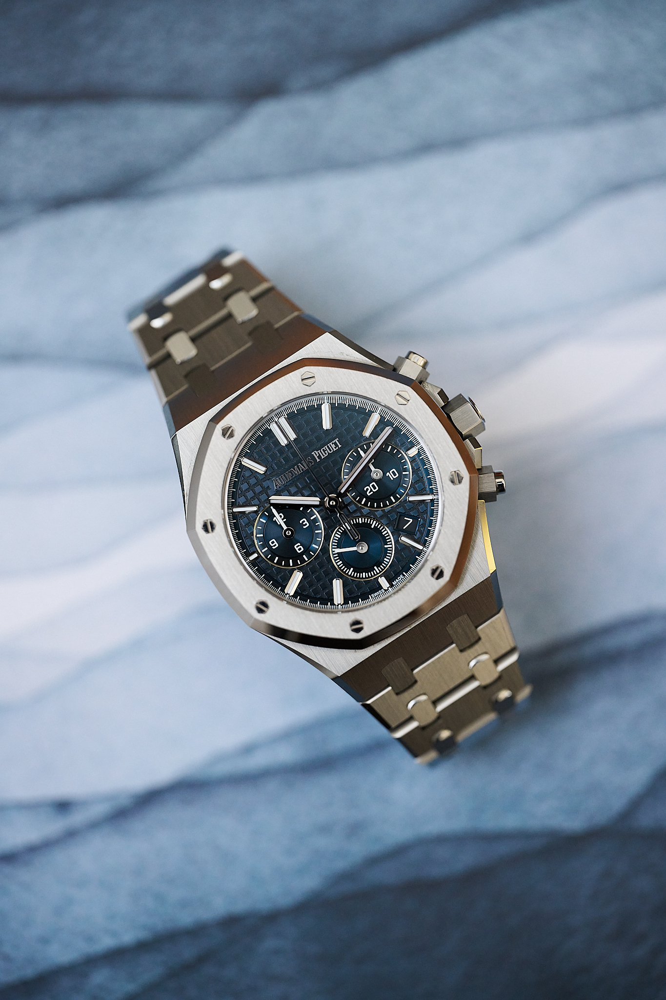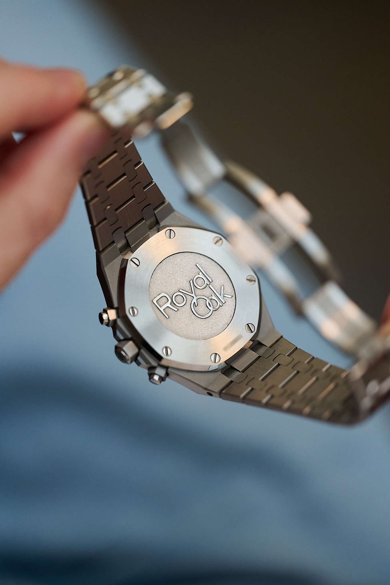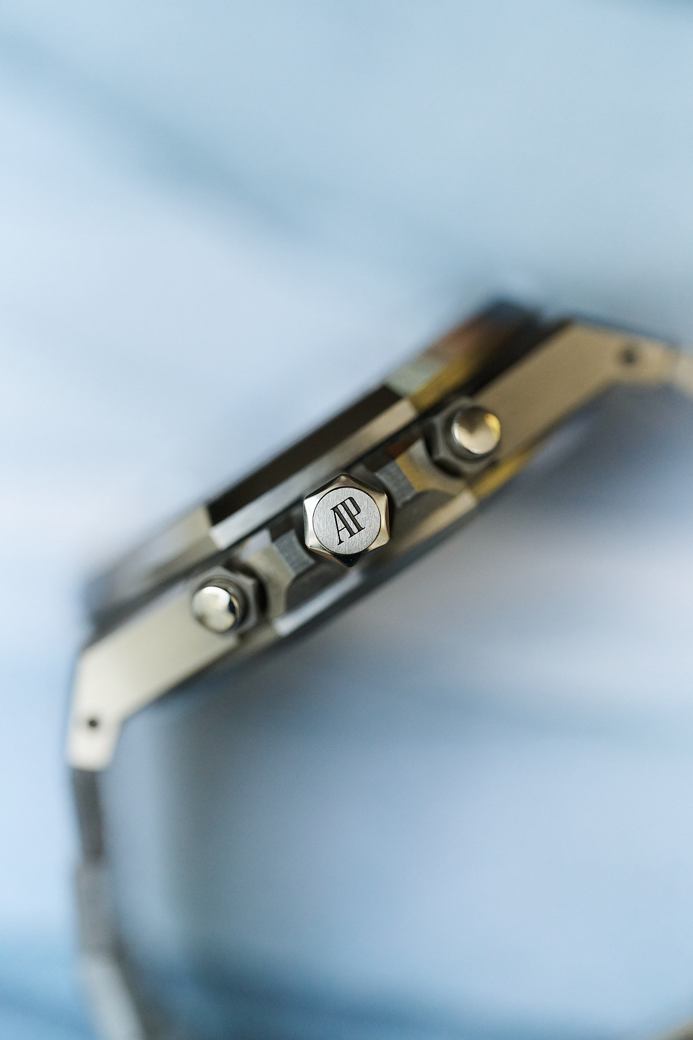 Its blue Grande Tapisserie dial is, of course, the configuration everyone wants. The hue is unmistakably tied to the original 5402: that same cool, steely blue that shifts character with the light, giving the watch both subtlety and presence. Paired with the deep texture of the tapisserie and the crisp white-gold markers, it’s the most coveted dial colour across the Royal Oak family - and particularly special in the 38mm chrono format.