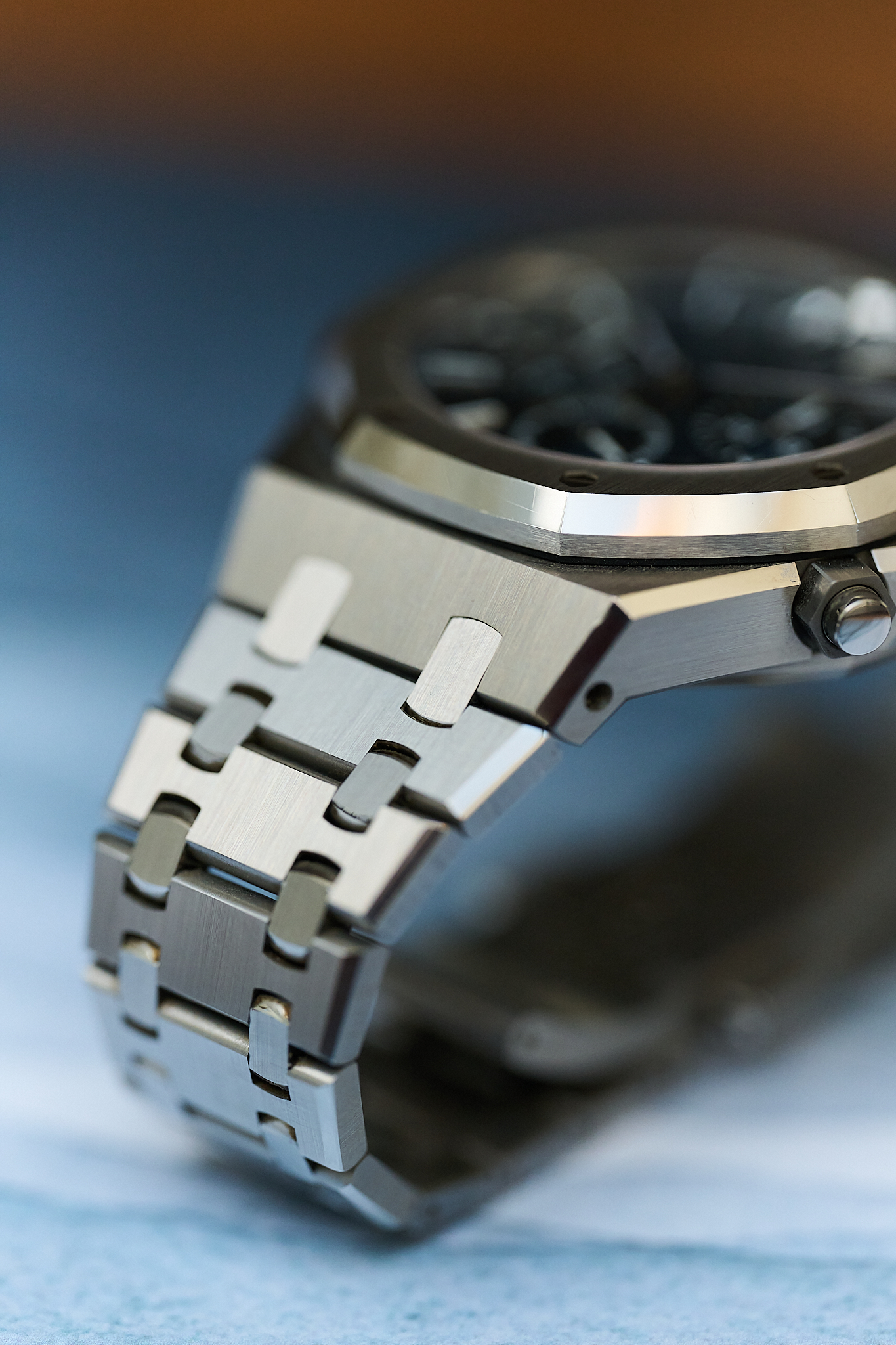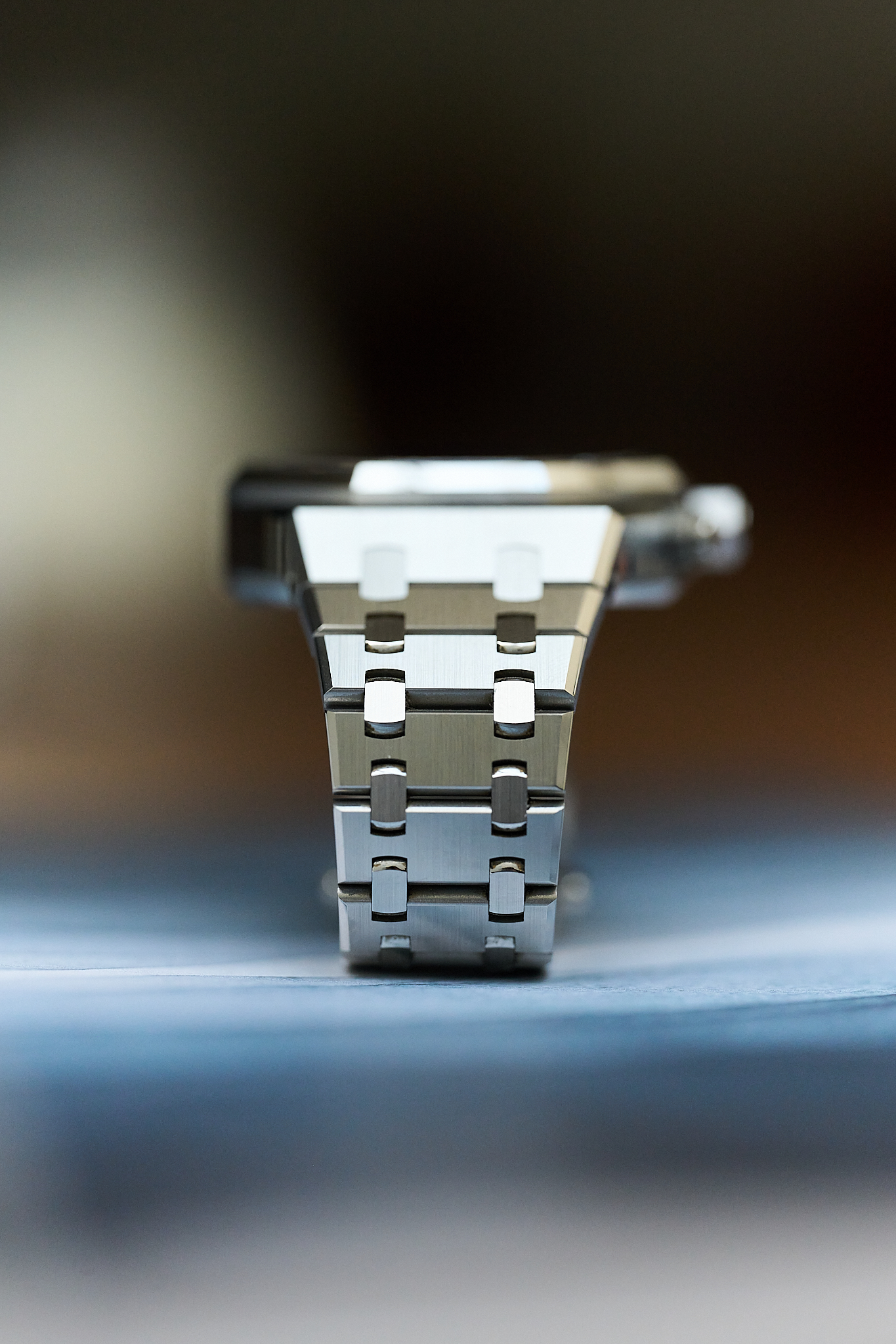 The 38mm case instantly feels “right” on the wrist - slim, proportionate, and deeply reminiscent of the earlier Royal Oak ethos, with razor-sharp bevels, flawless brushing and all the geometry that makes the design so enduring. It’s a reference that has only grown in collector appeal since the upward-trend towards smaller-sized watches.