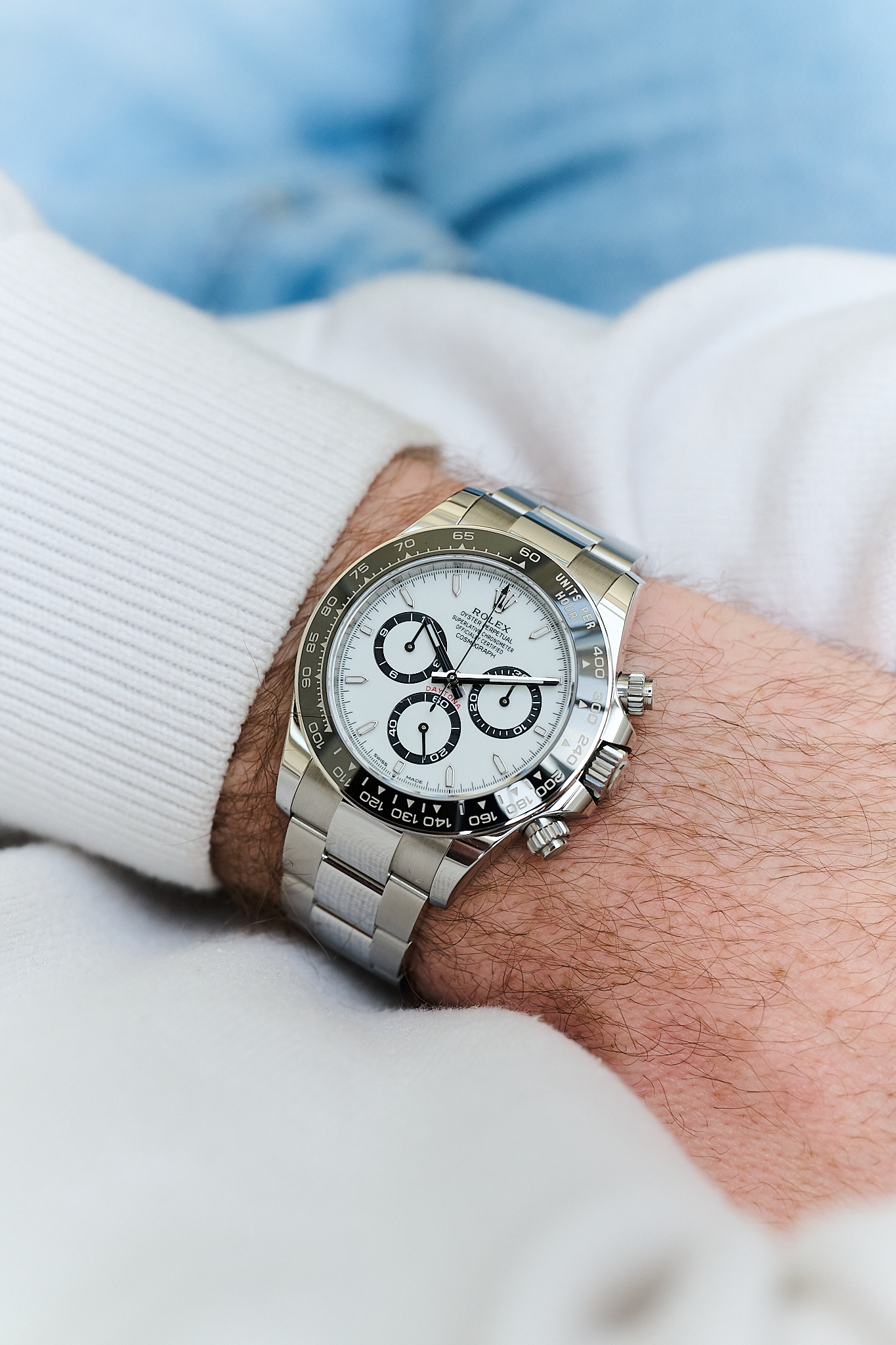 This particular reference is of course rose gold, and its gorgeous sunburst blue dial with black-gradient rim is embellished with twelve baguette-cut diamond hour markers (totalling 0.26ct), which give the watch the absolute perfect level of shine whilst remaining somewhat subtle in appearance.