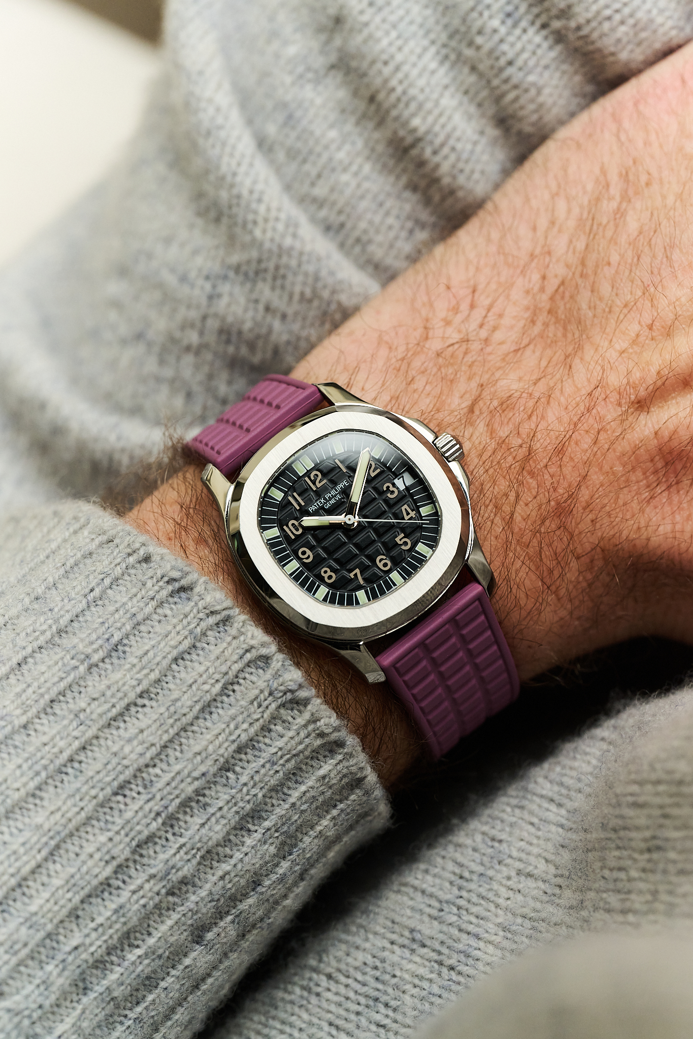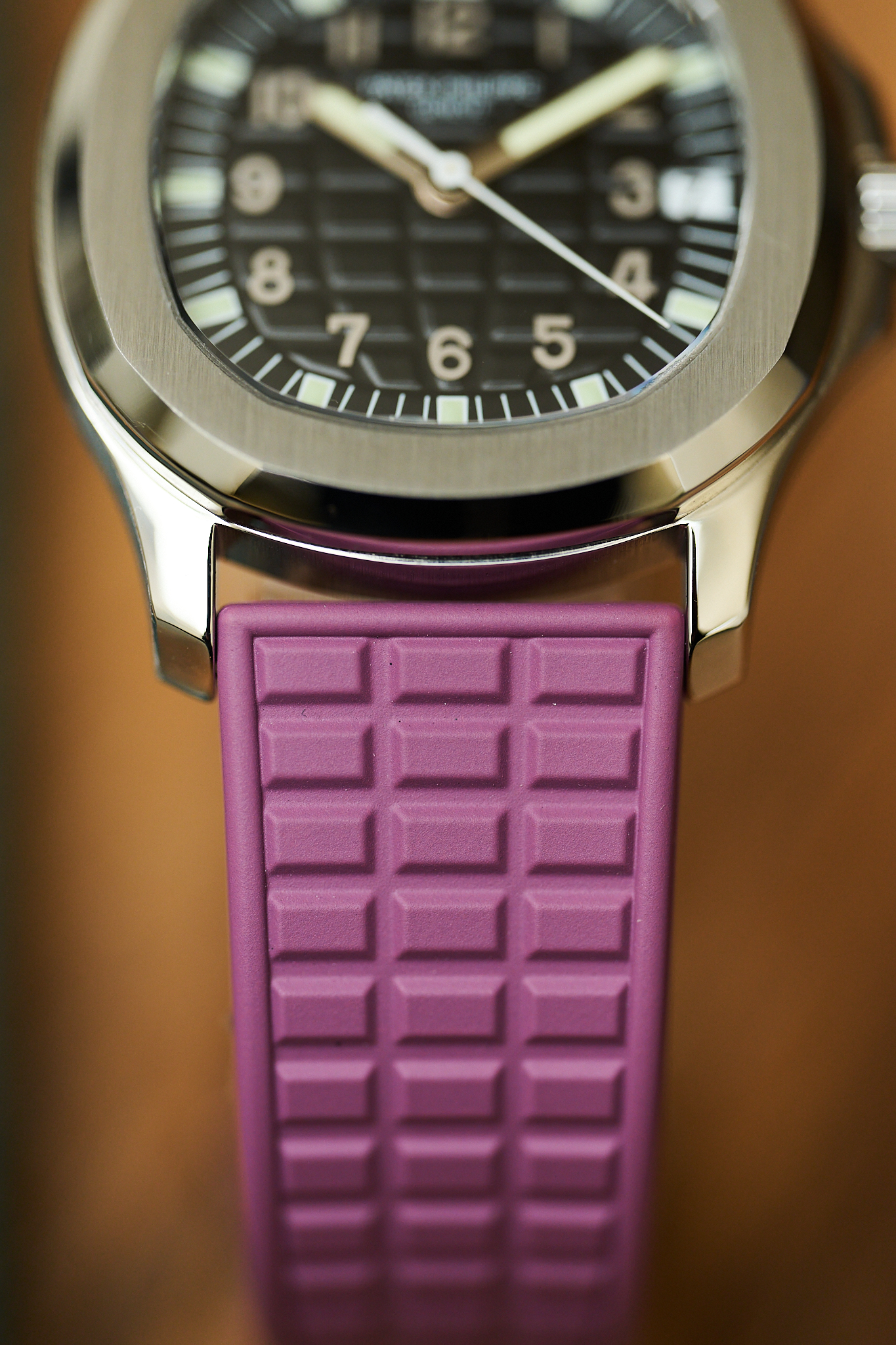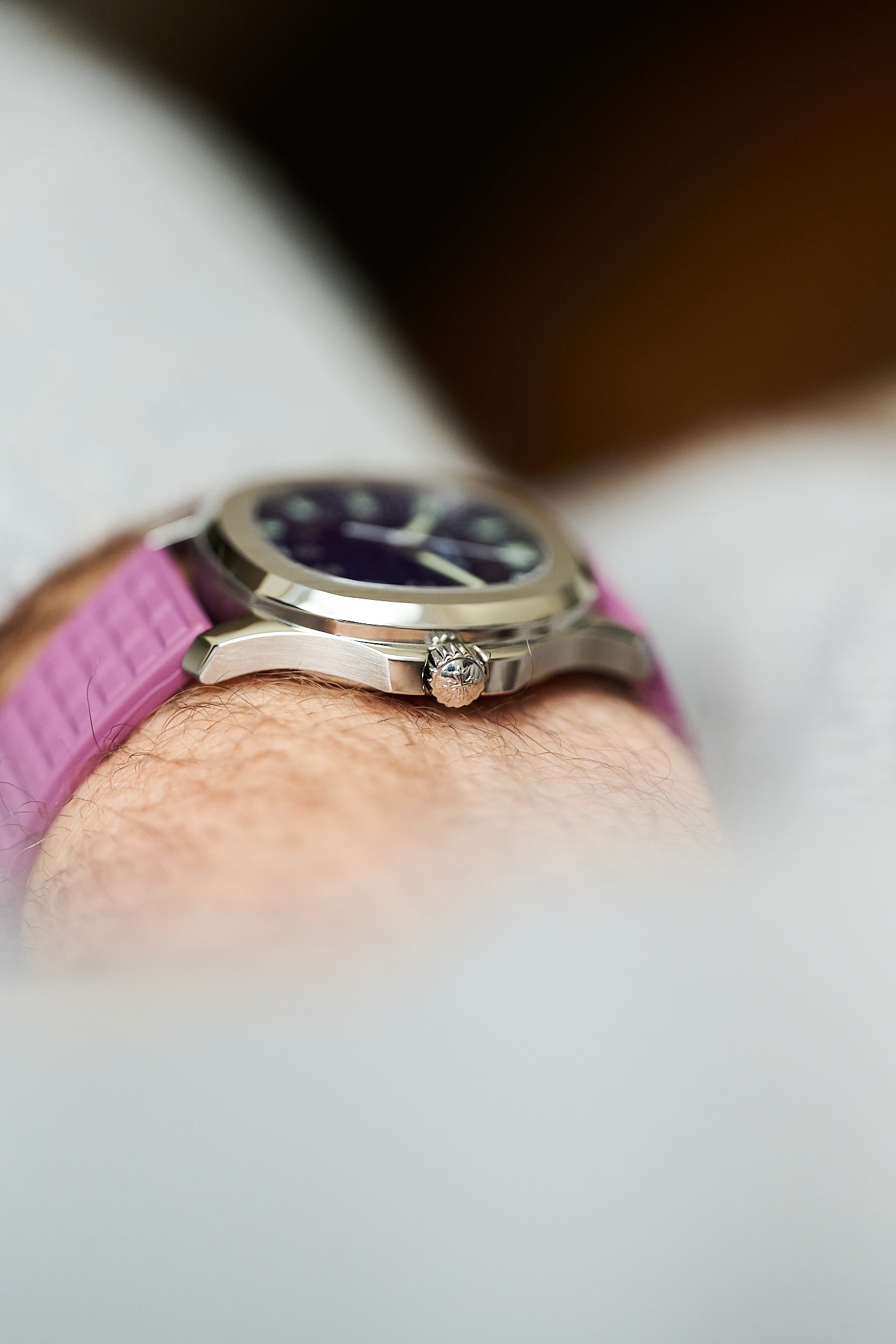 Another charming aspect of the 5066A is the versatility it offers its owner. With 18 different strap colours available from Patek Philippe, the watch can be tailored perfectly to its wearer - from classic black to far more playful options. This example is fitted to a rarely seen mauve strap, which we think pairs exceptionally well with the steel case and gives the watch that slightly more playful, contemporary feel.