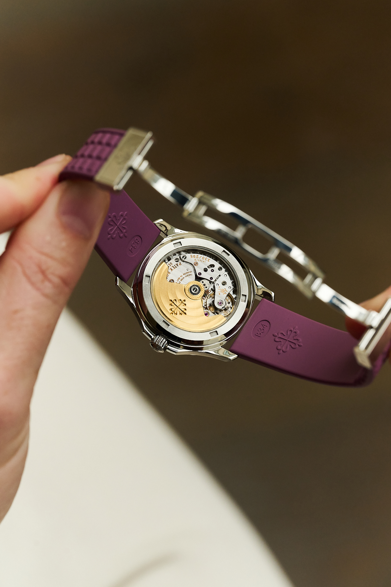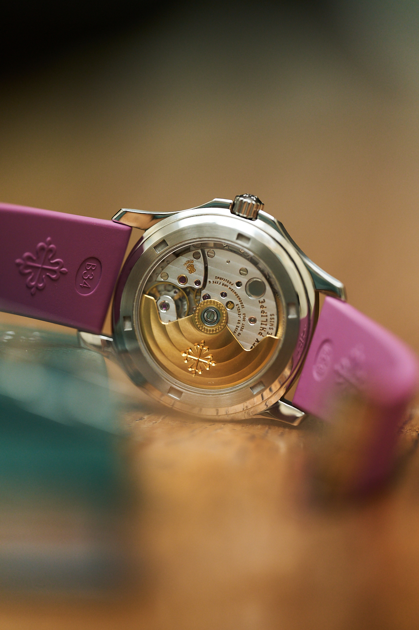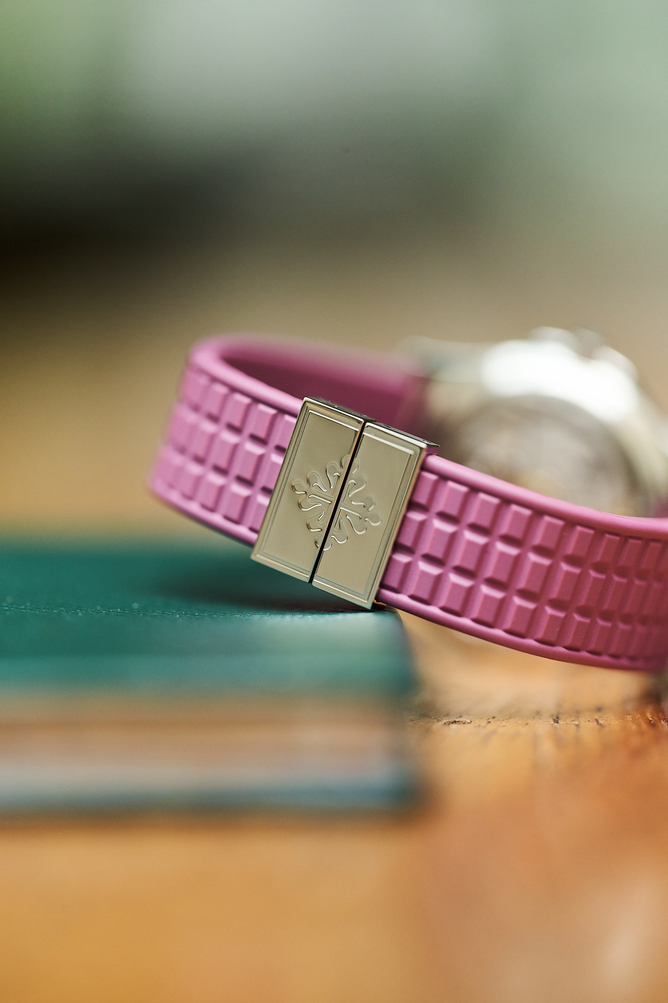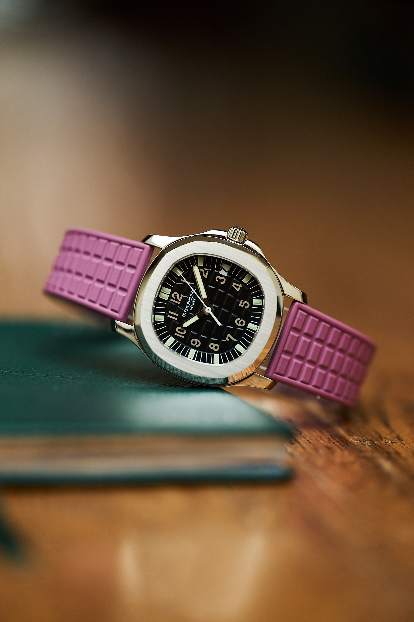 Another charming aspect of the 5066A is the versatility it offers its owner. With 18 different strap colours available from Patek Philippe, the watch can be tailored perfectly to its wearer - from classic black to far more playful options. This example is fitted to a rarely seen mauve strap, which we think pairs exceptionally well with the steel case and gives the watch that slightly more playful, contemporary feel.