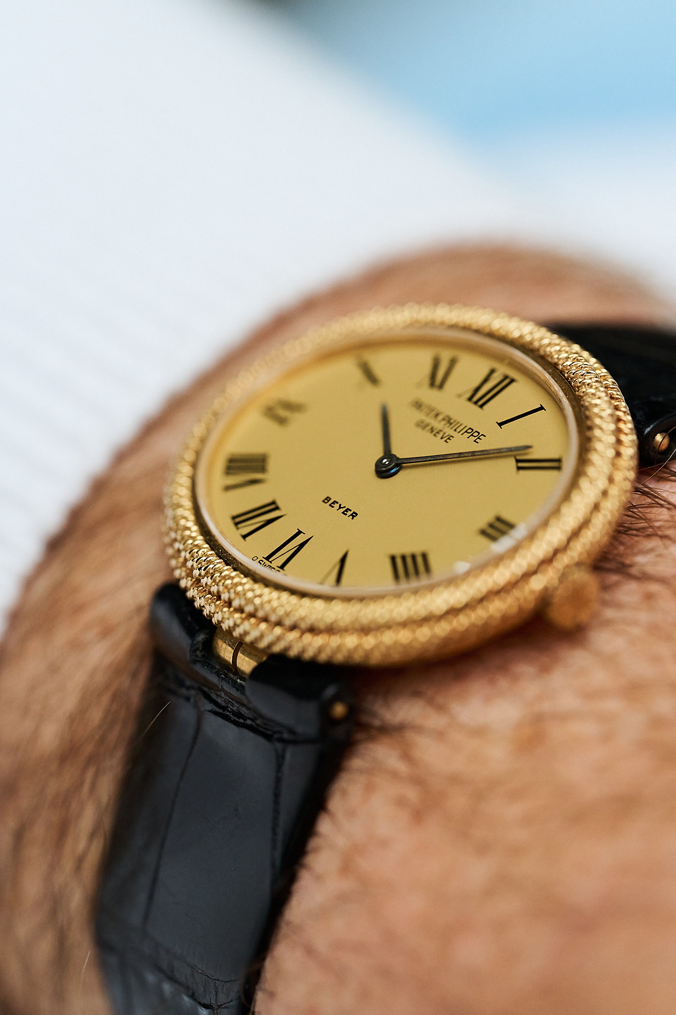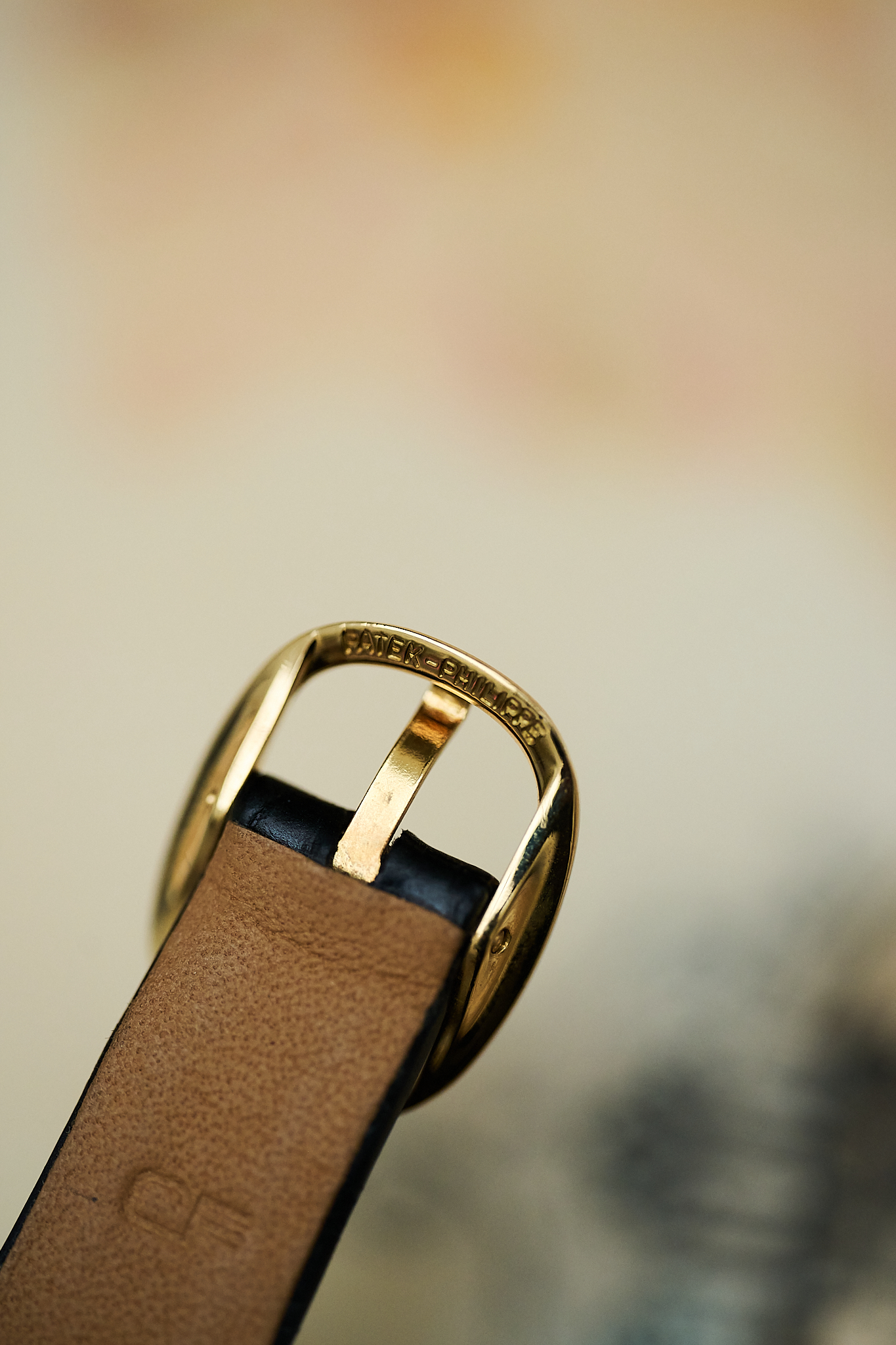 The minimalist champagne dial is beautifully balanced, featuring crisp black Roman numerals and hands, and notably bears a rare double signature from Beyer Zürich - one of Patek Philippe’s longest-standing and most prestigious retail partners. Such examples are seldom seen, and speak to the close relationships Patek maintained with its historic retailers.