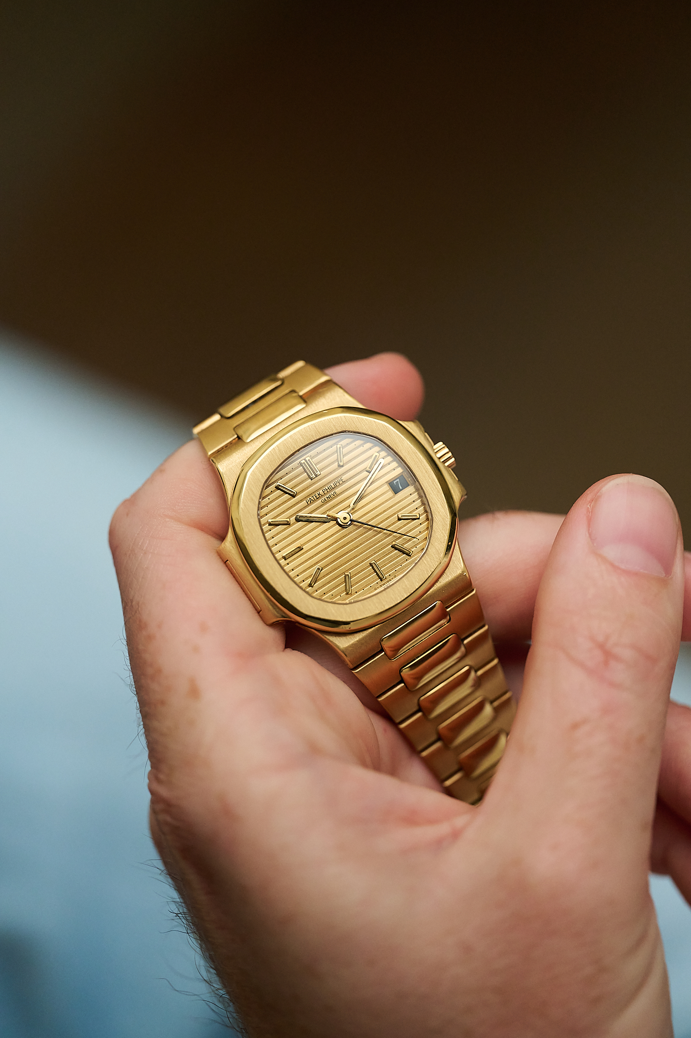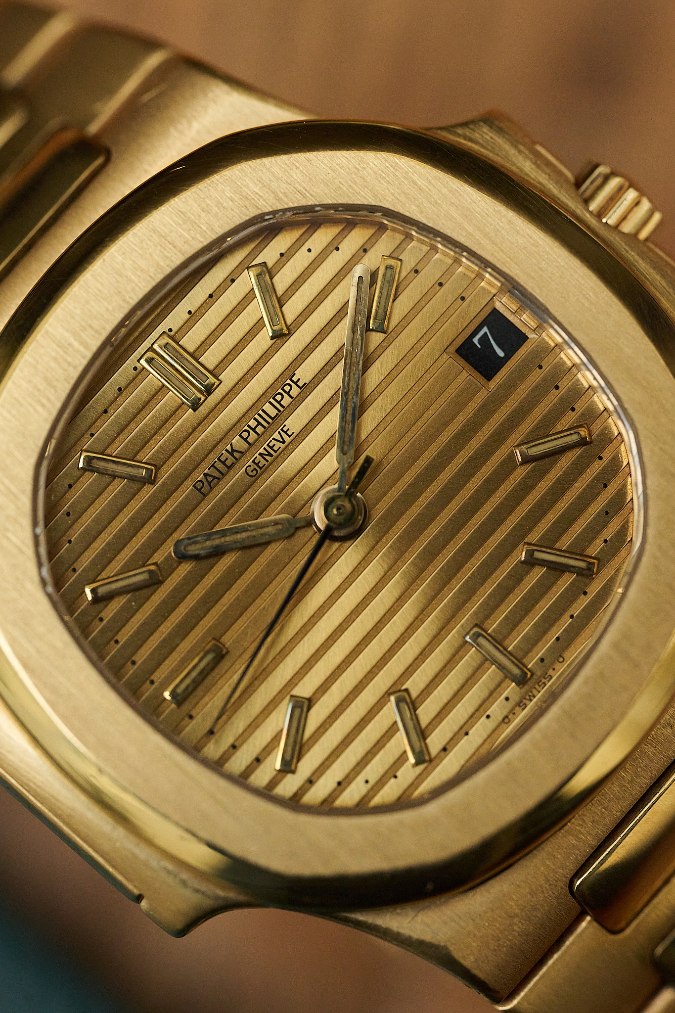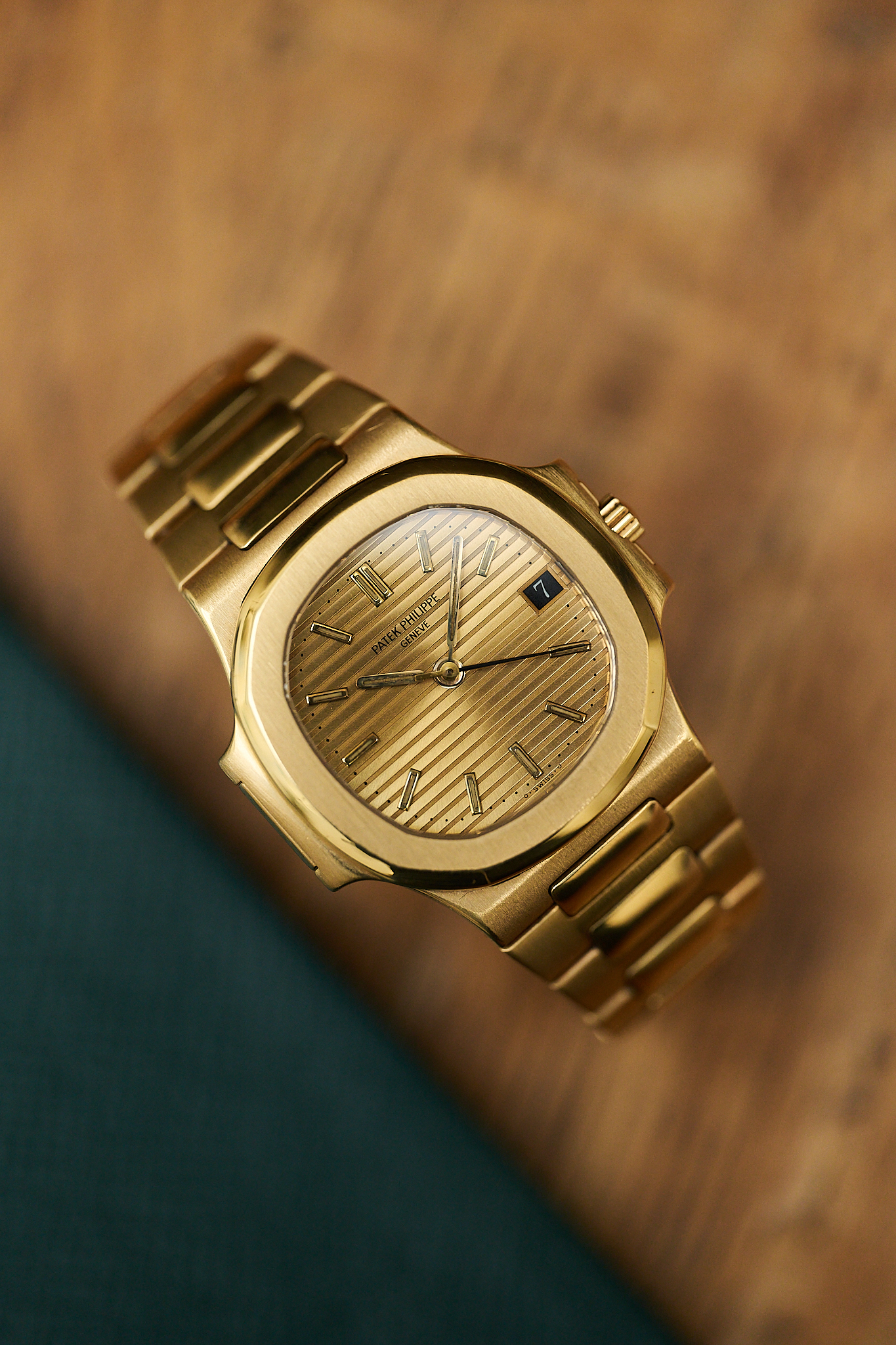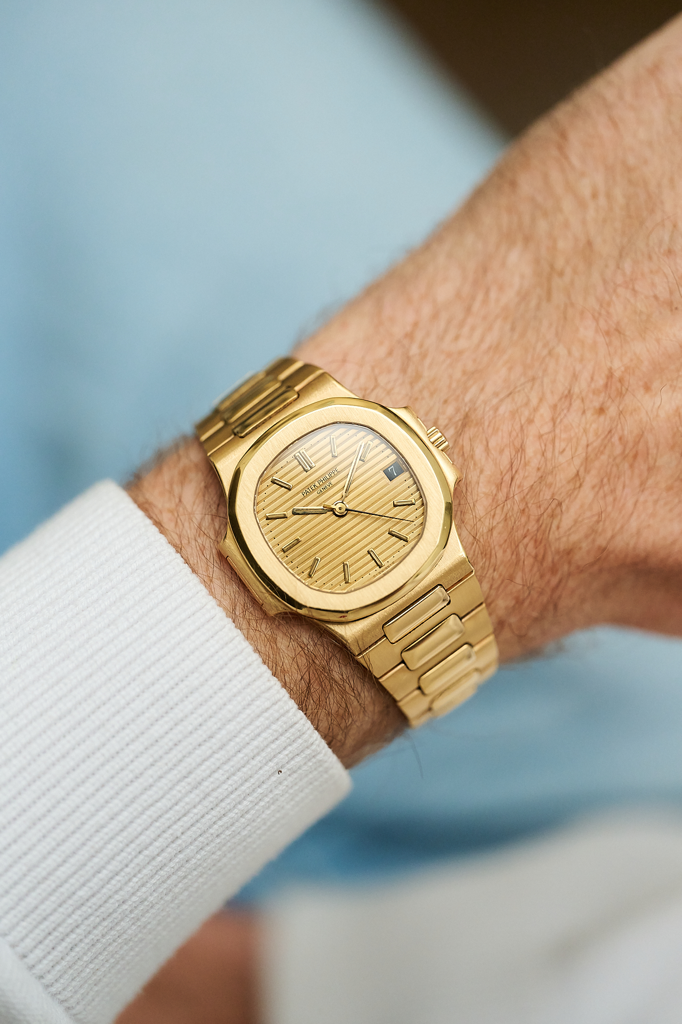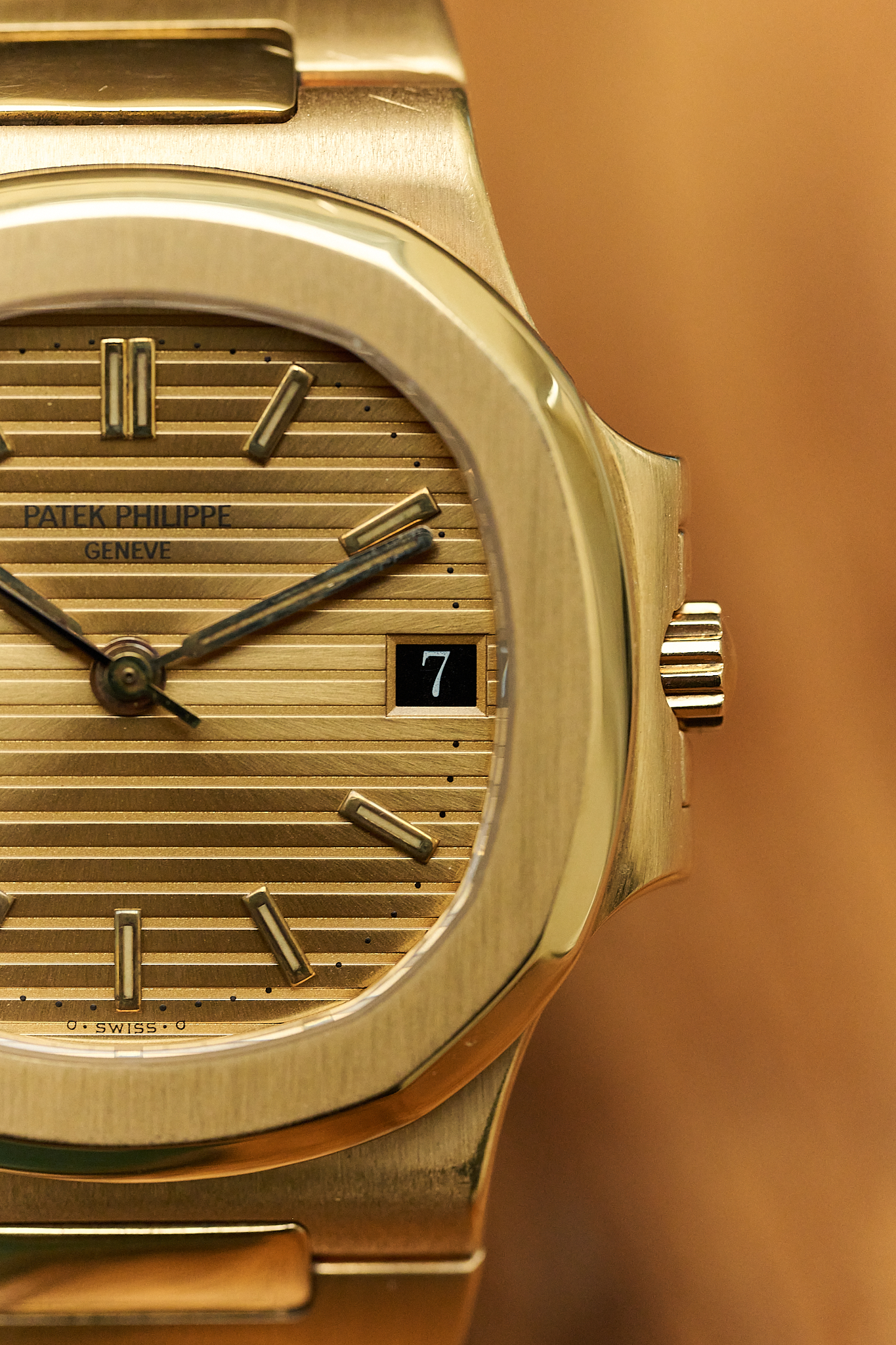 Now available, a Patek Philippe Nautilus reference 3800 in yellow gold with the seldom-seen “doré” dial and contrasting black date window.