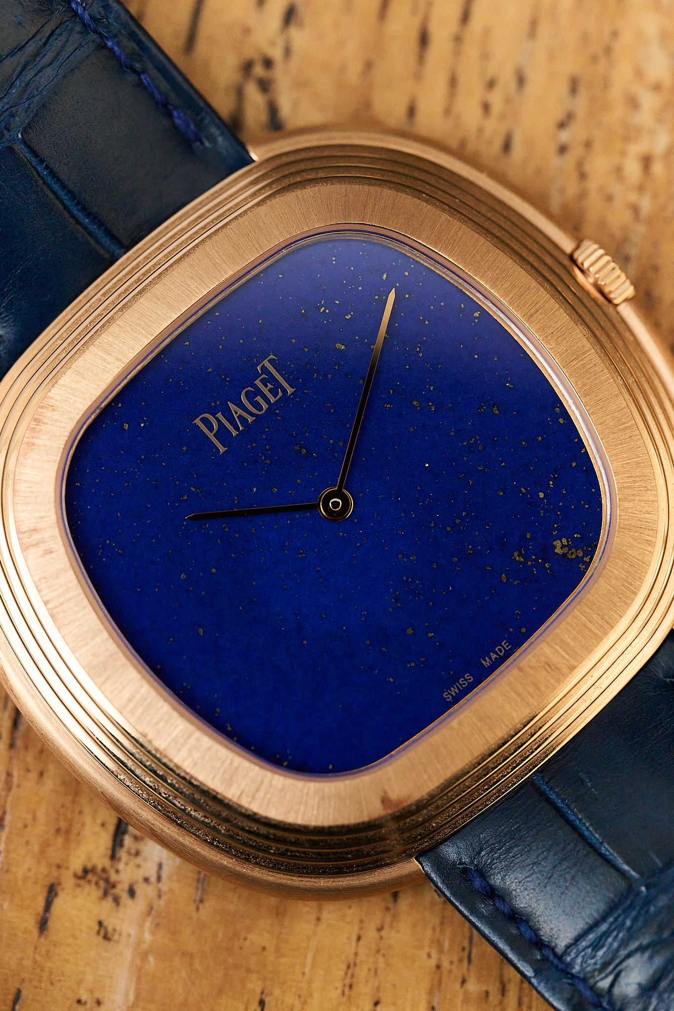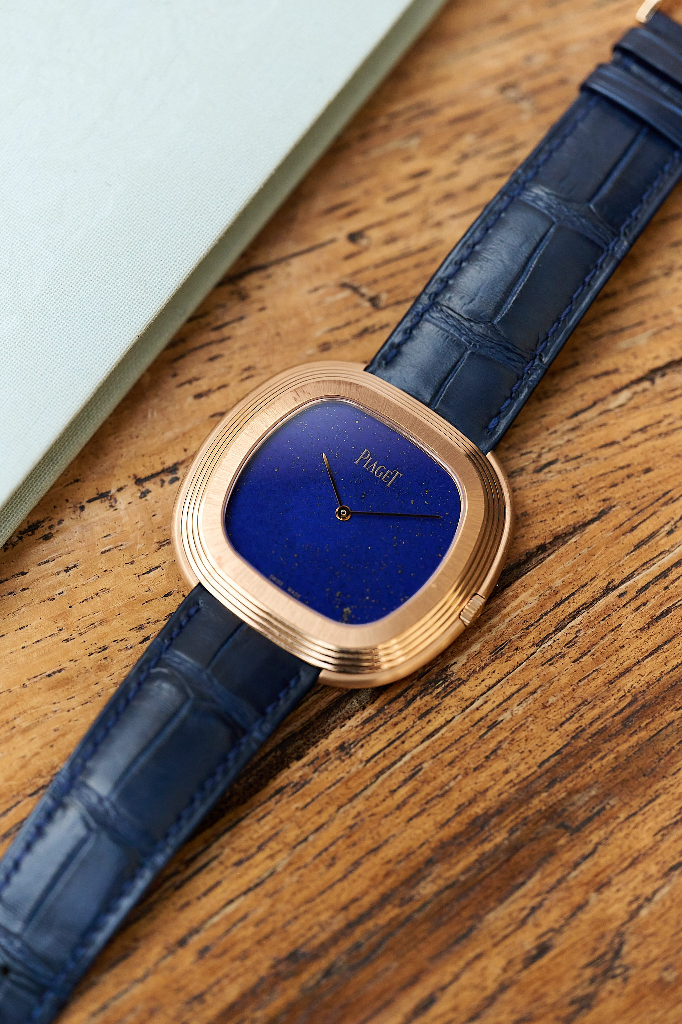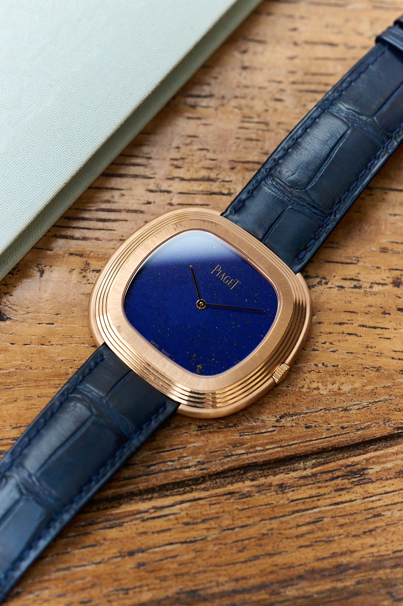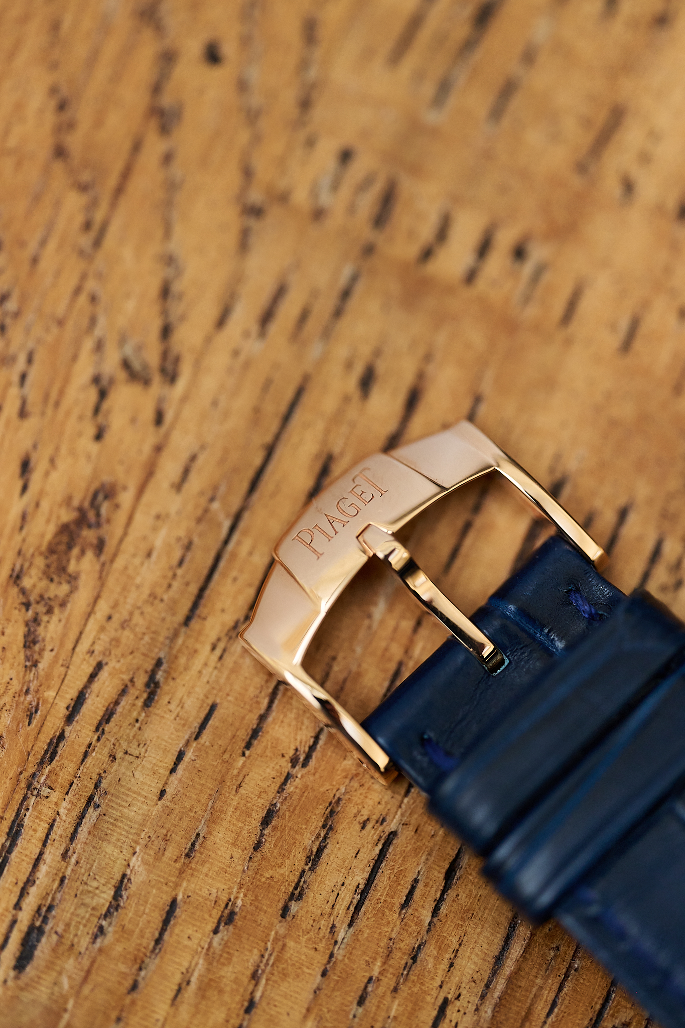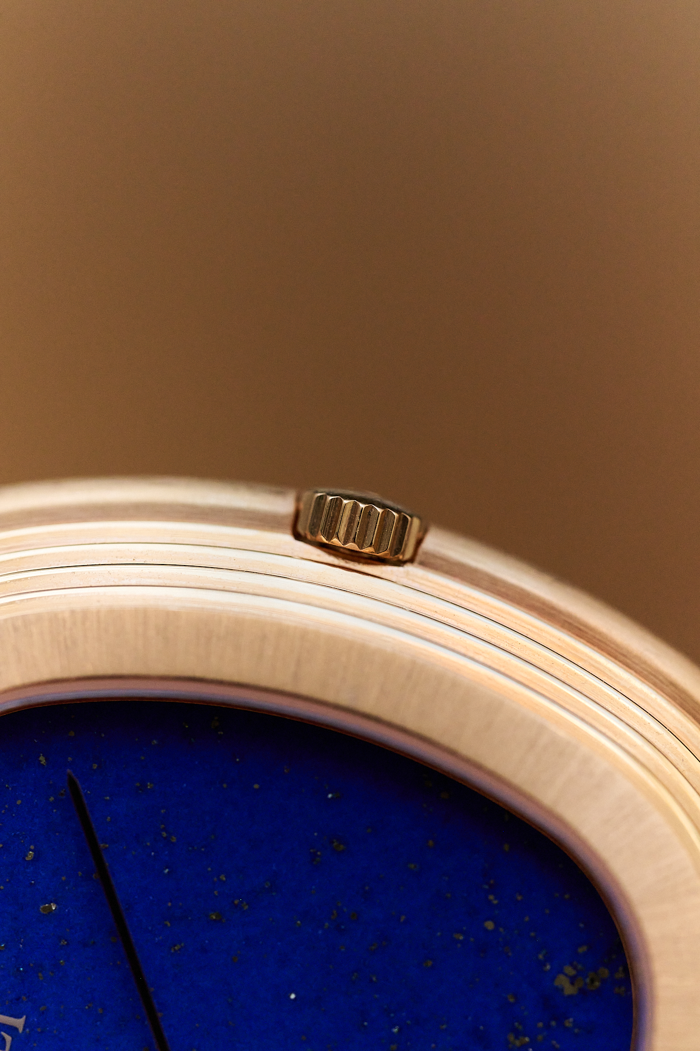 The dial is a beauty - rich ultramarine with naturally flecked gold pyrite, the sort of organic texture no modern technique can replicate. Framed by the warm, ridged 18k rose gold case, it has that quiet glamour Piaget mastered during its high-creativity era; elegant, slim, and effortlessly chic.