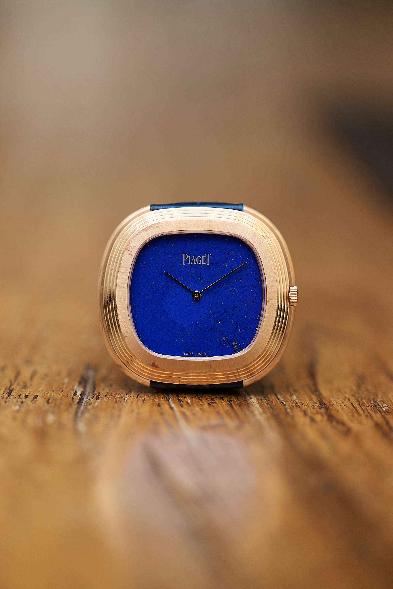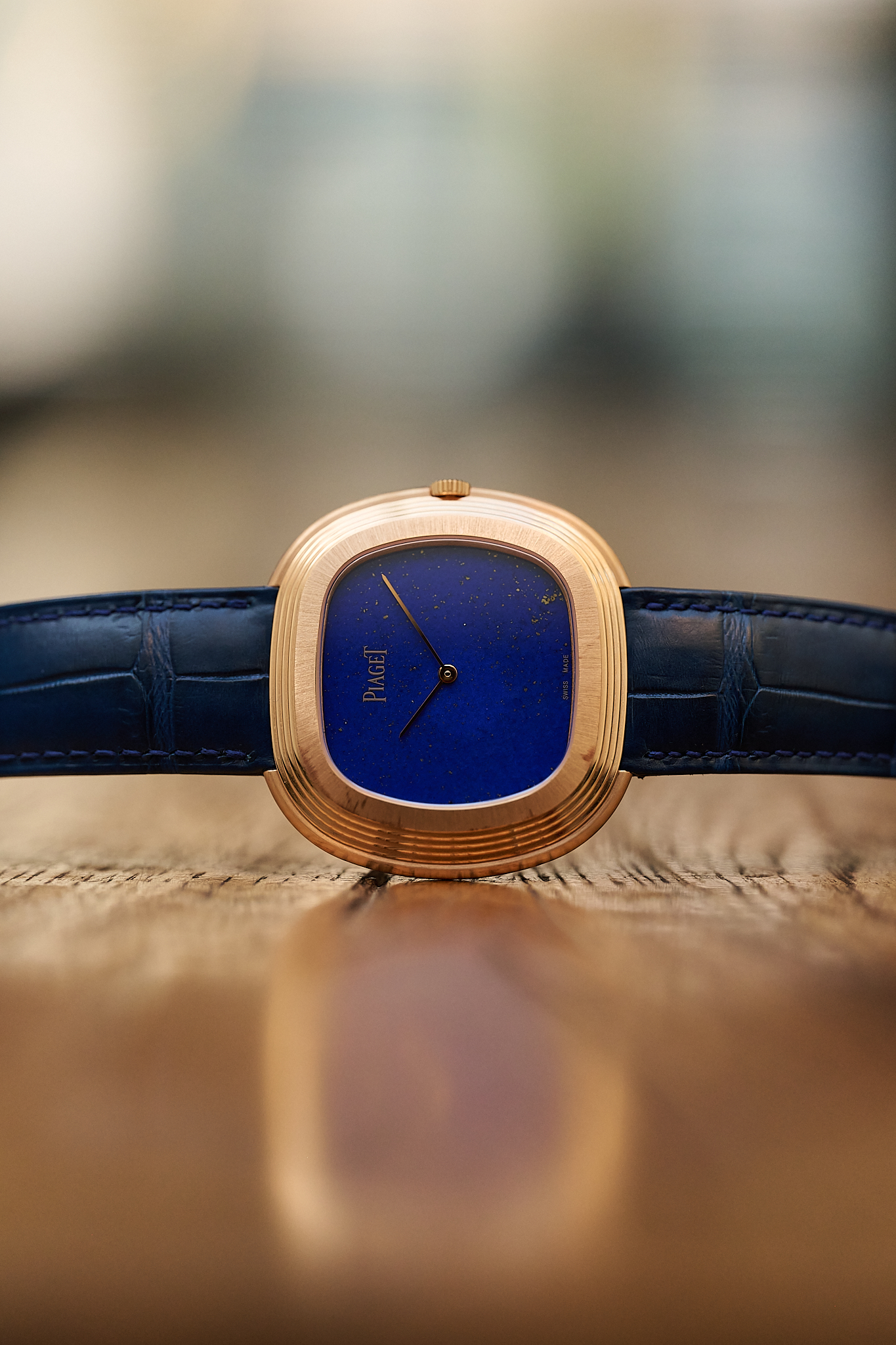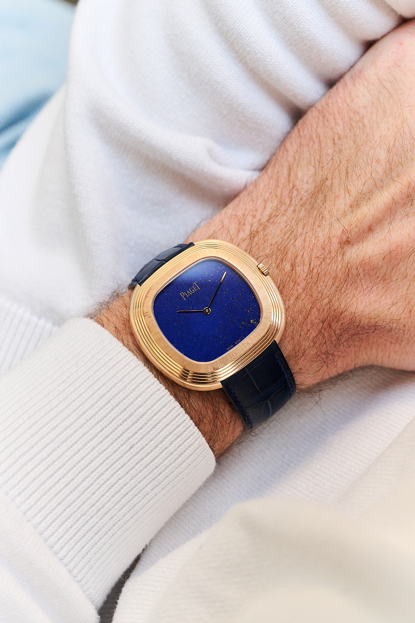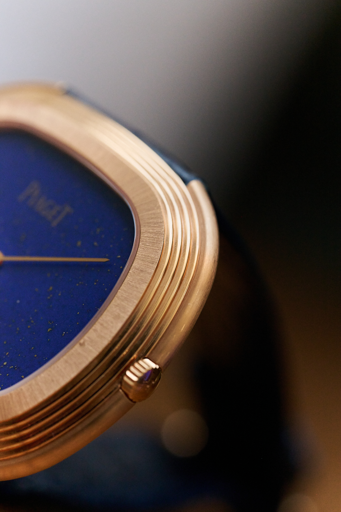 The dial is a beauty - rich ultramarine with naturally flecked gold pyrite, the sort of organic texture no modern technique can replicate. Framed by the warm, ridged 18k rose gold case, it has that quiet glamour Piaget mastered during its high-creativity era; elegant, slim, and effortlessly chic.