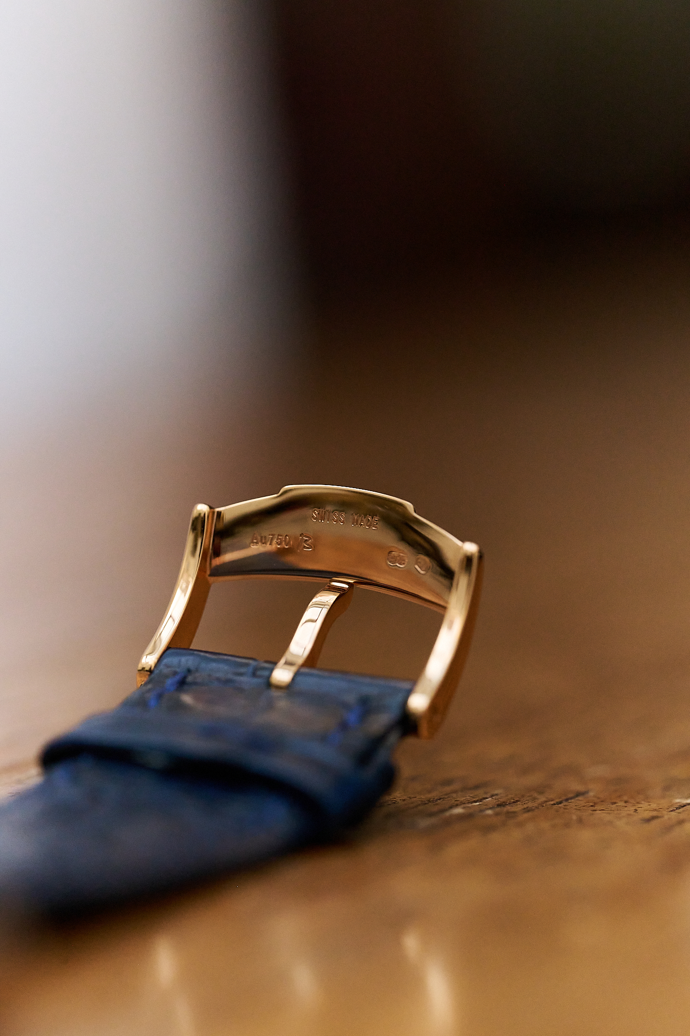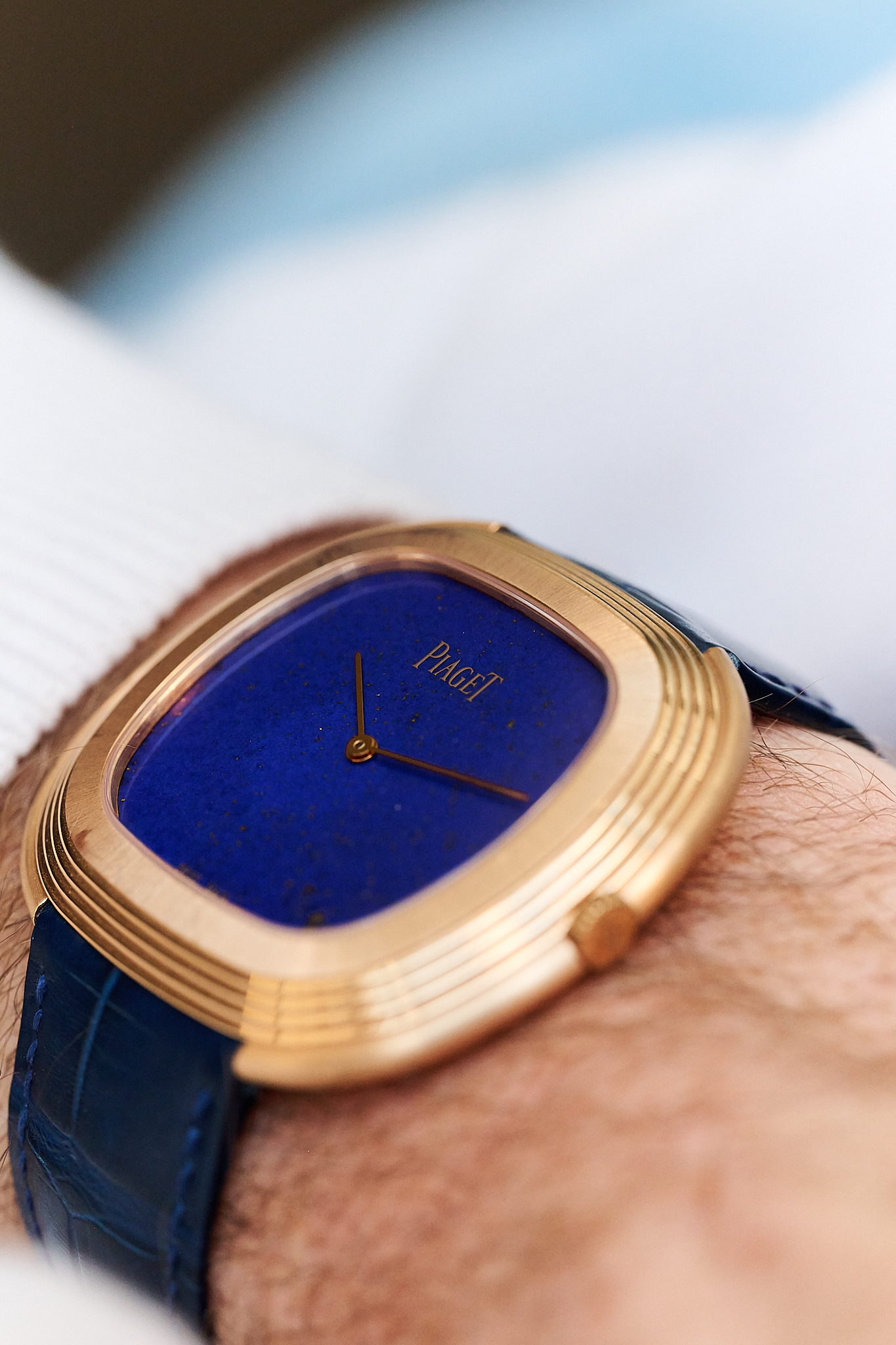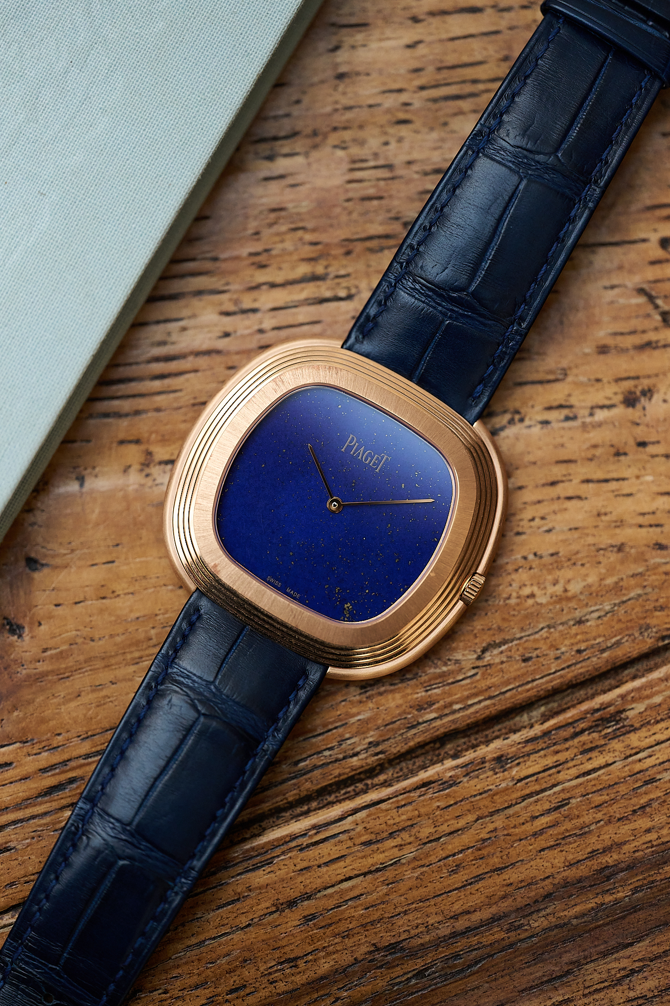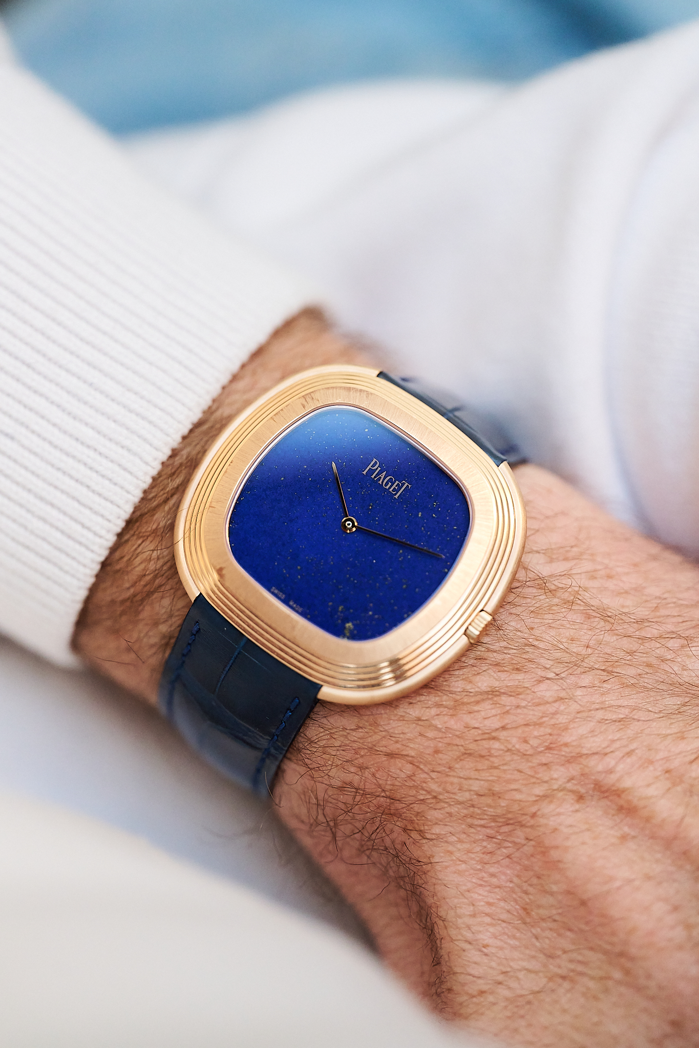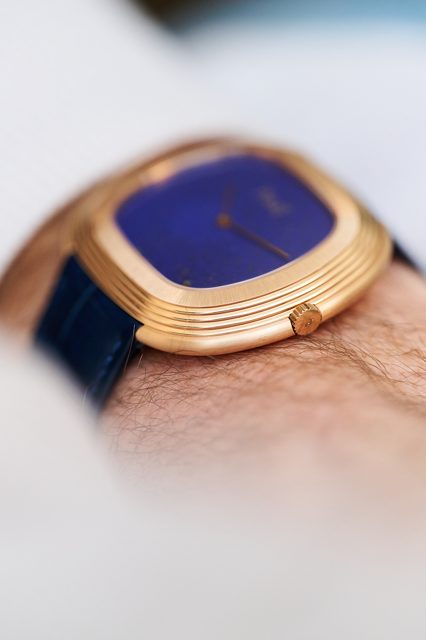 The dial is a beauty - rich ultramarine with naturally flecked gold pyrite, the sort of organic texture no modern technique can replicate. Framed by the warm, ridged 18k rose gold case, it has that quiet glamour Piaget mastered during its high-creativity era; elegant, slim, and effortlessly chic.