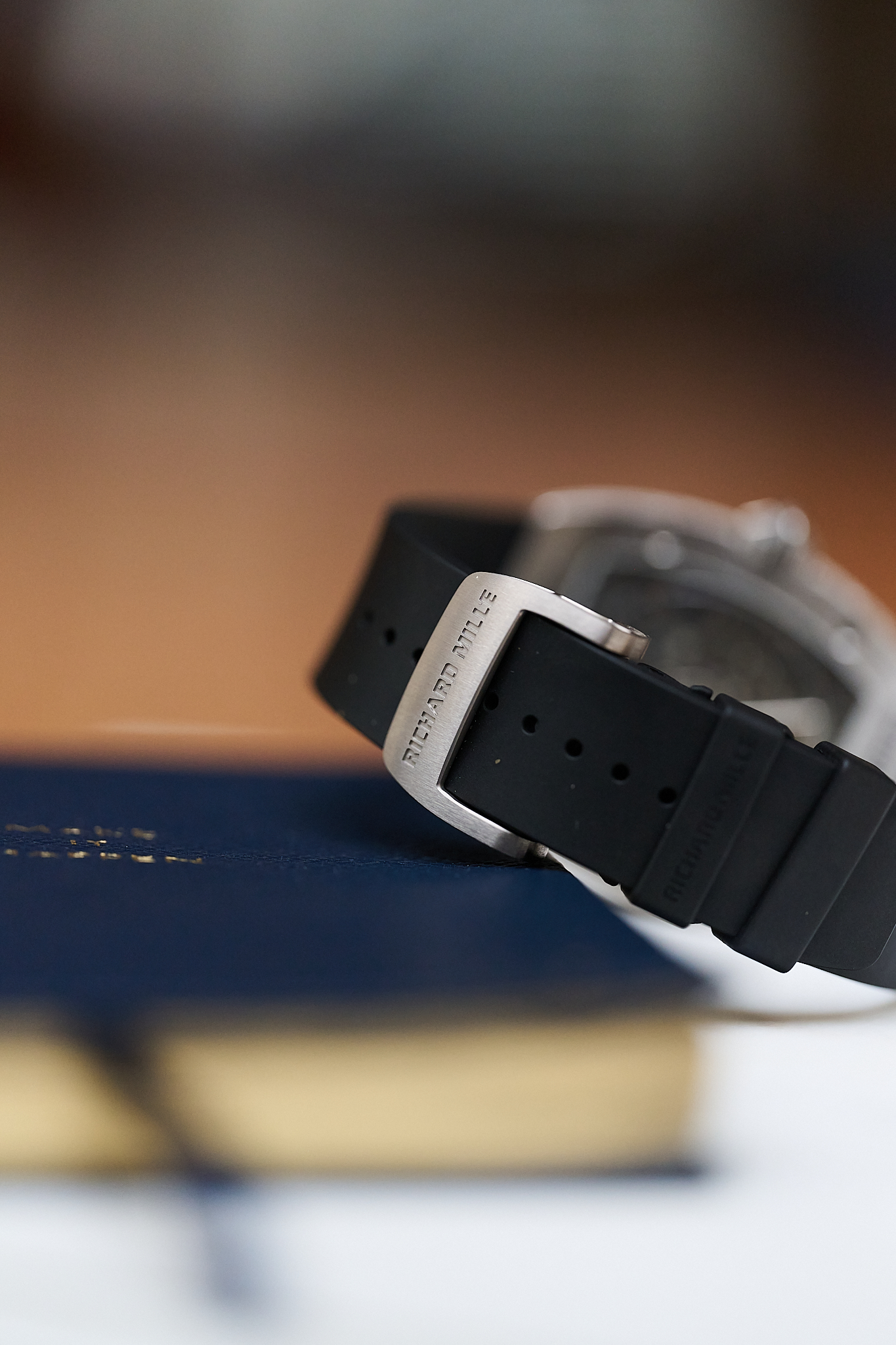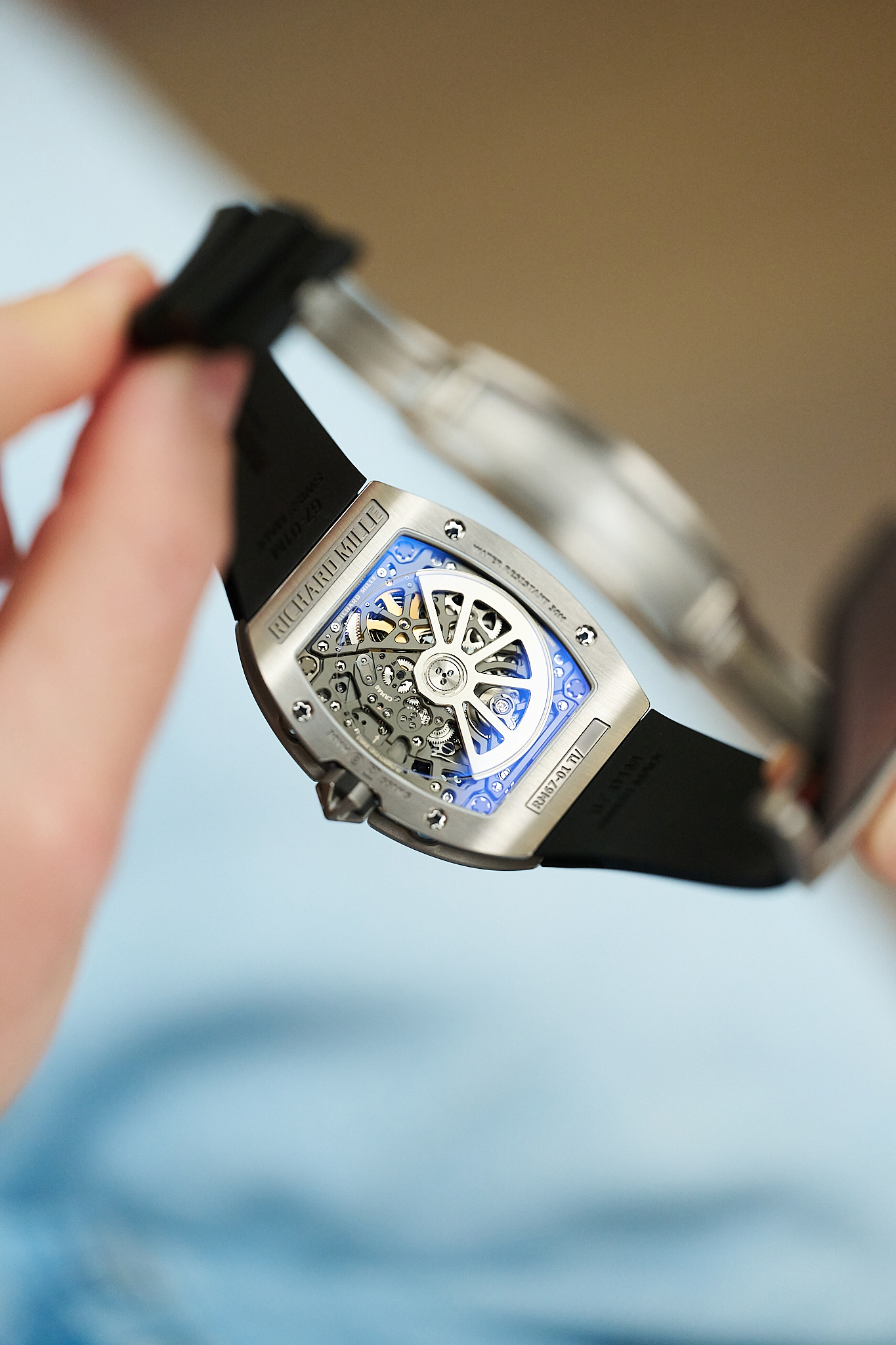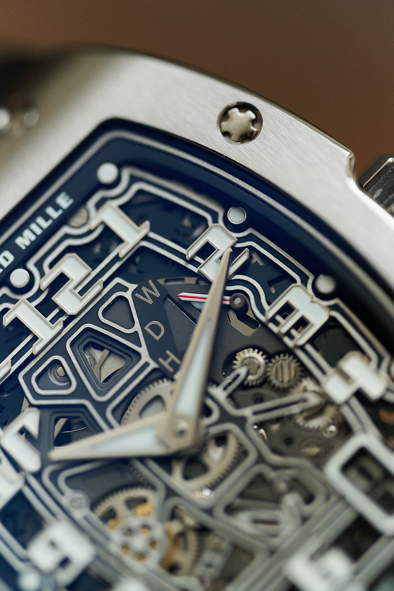 Its skeletonised dial is classic RM: architectural, layered, and full of depth, yet still clean enough to read at a glance. The rehaut takes on a neutral, brushed metallic tone - a crisp frame to the floating numerals and openworked lattice beneath - keeping the focus on the movement rather than adding colour. It’s modern, technical, and unmistakably Mille.