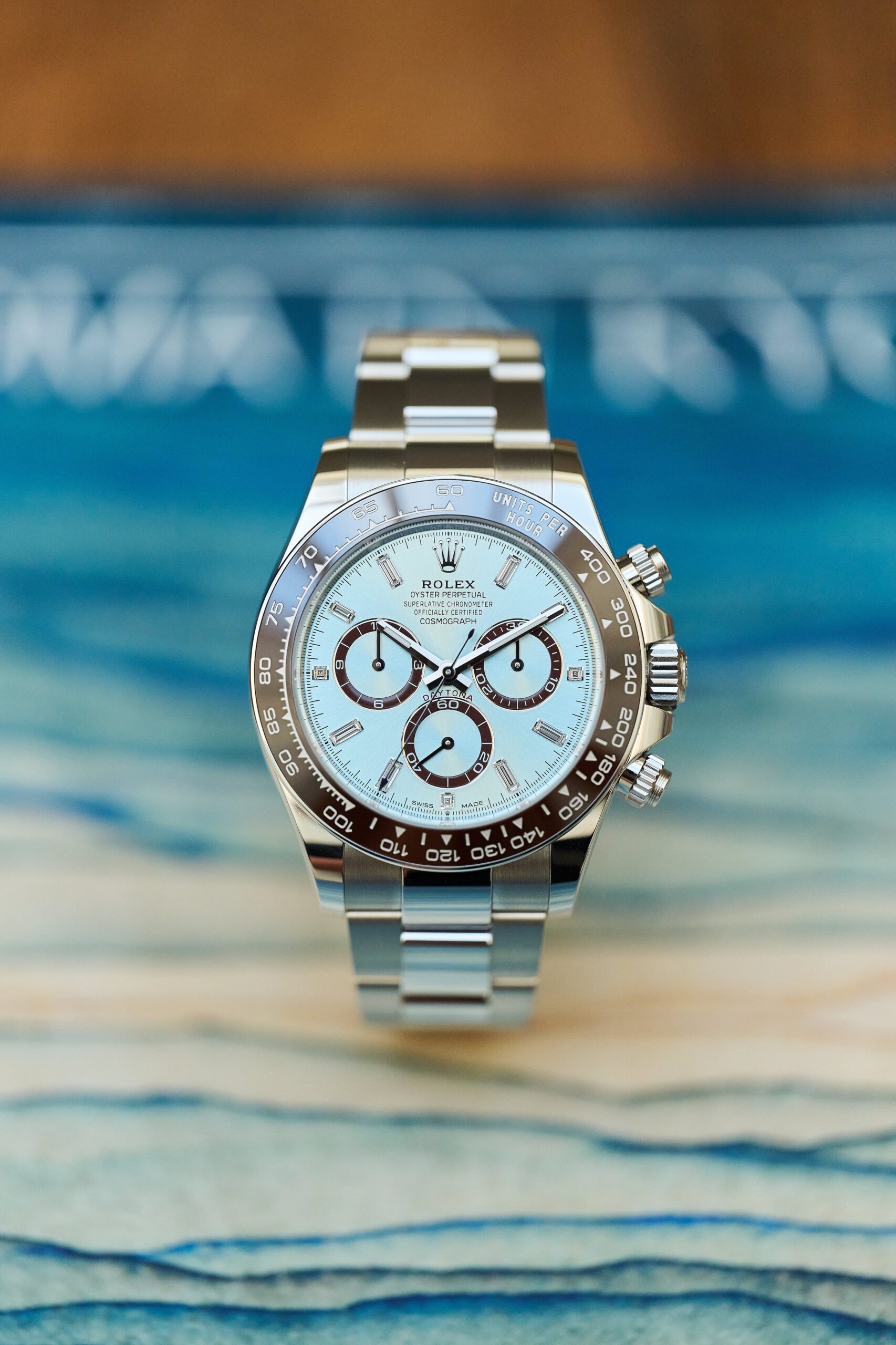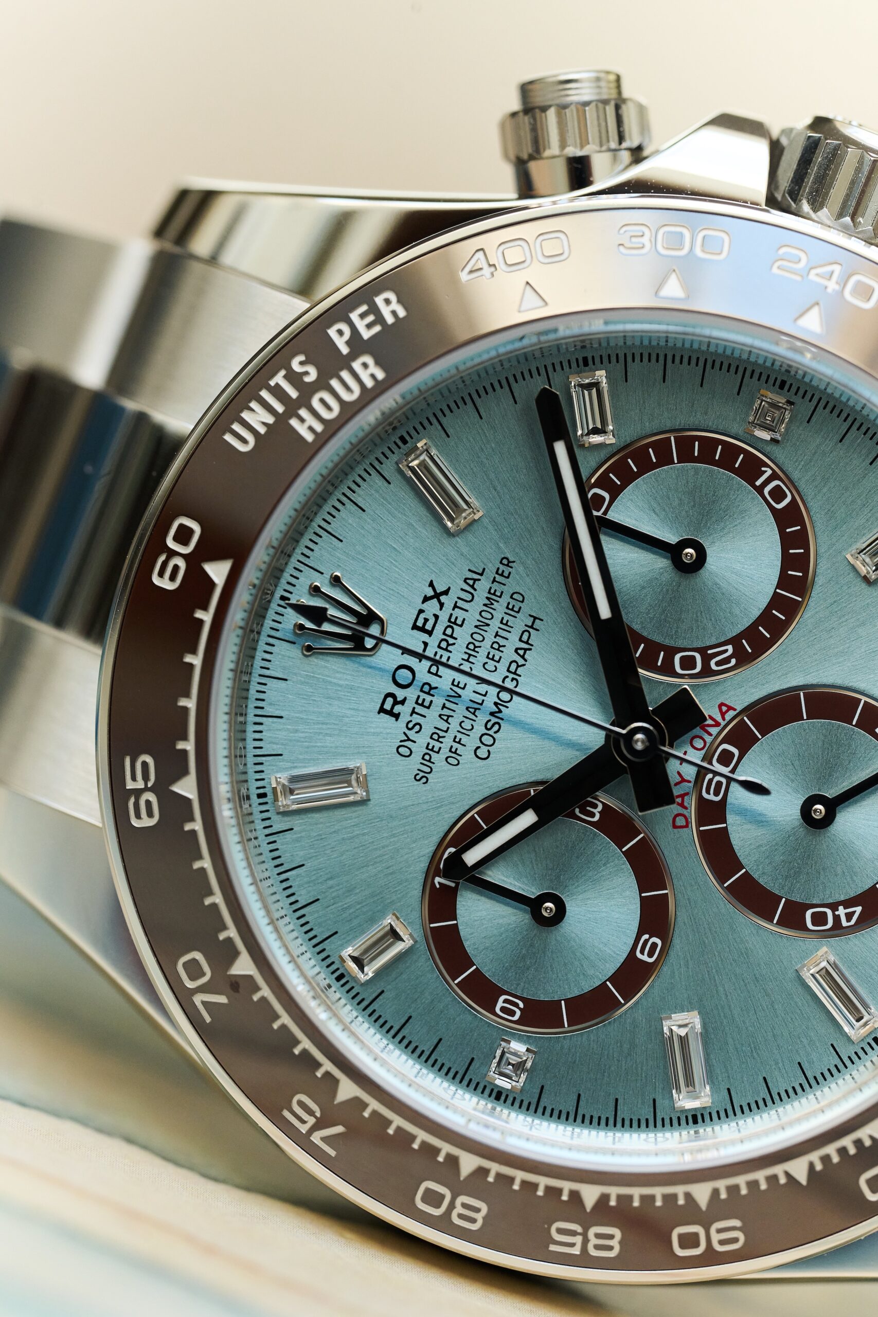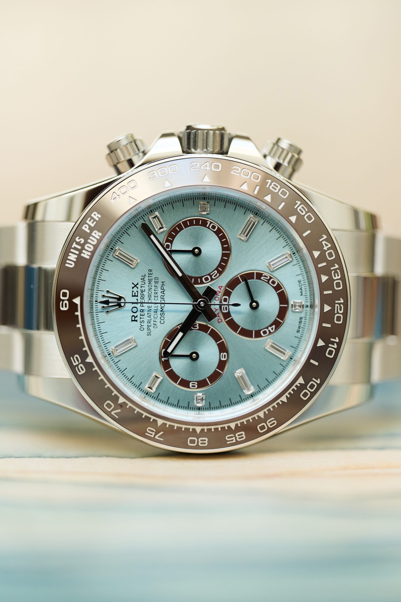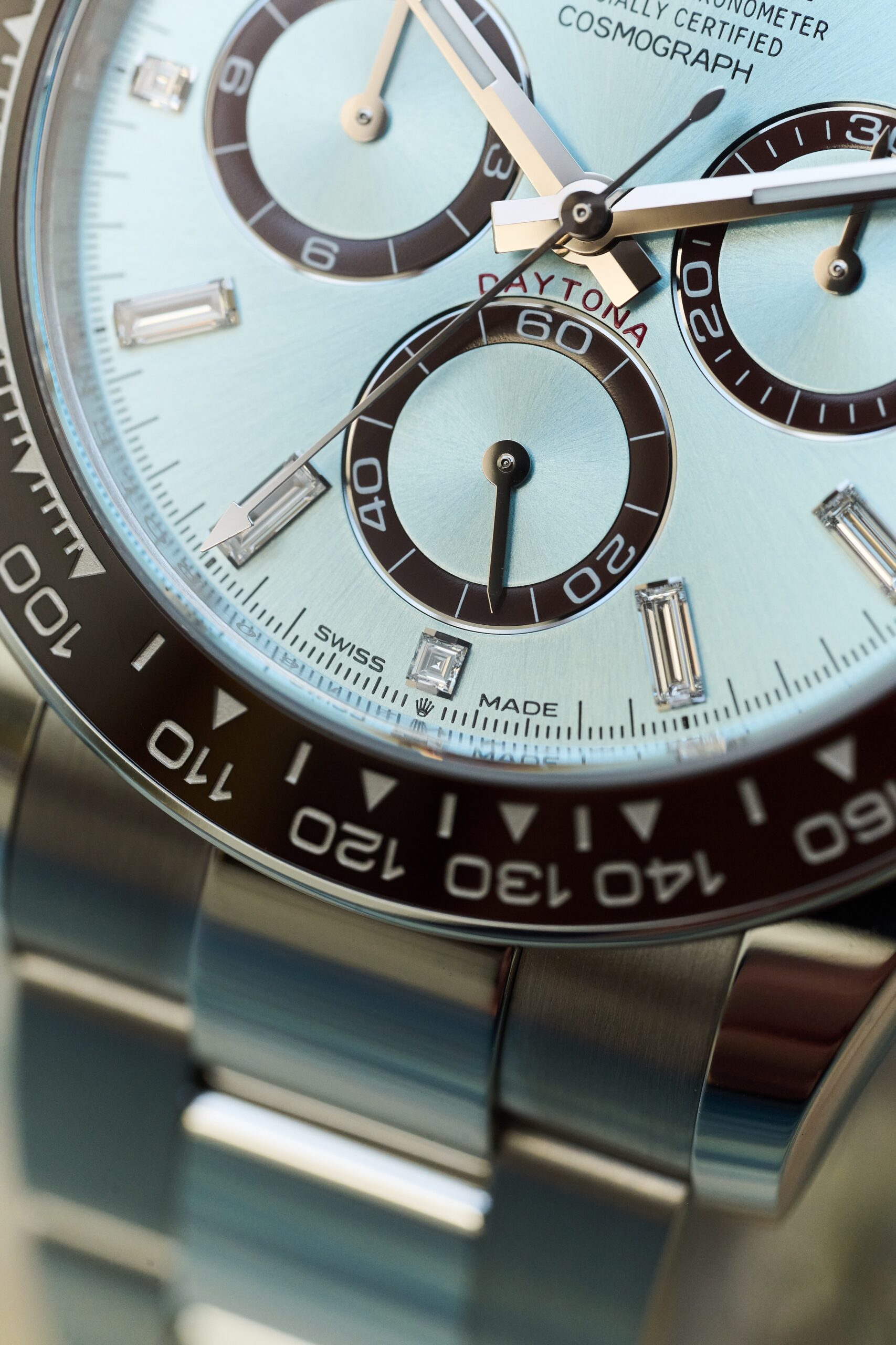 The 126506 sits at the very top of Rolex’s contemporary chronograph offering: a full-platinum Daytona with the signature ice-blue sunburst dial and chestnut-brown Cerachrom bezel. The baguette-diamond hour markers, however, give this reference a distinct personality. Rather than the standard lume-filled hour markers, the dial is framed by twelve razor-clean, perfectly matched diamond batons - jewellery-level finishing executed with Rolex’s usual precision and restraint. In natural light, they catch just enough brilliance to remind you this isn’t an ordinary Daytona.