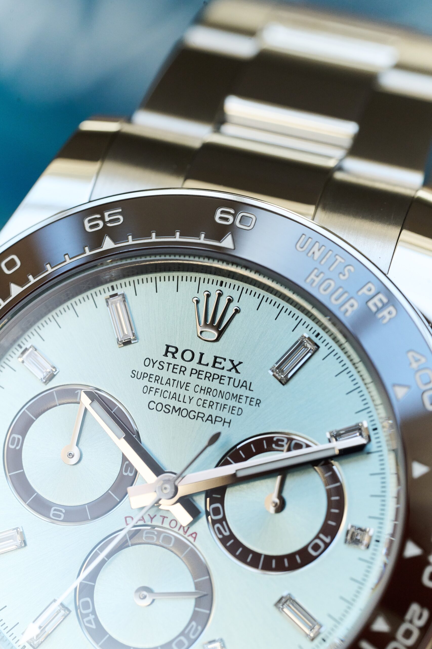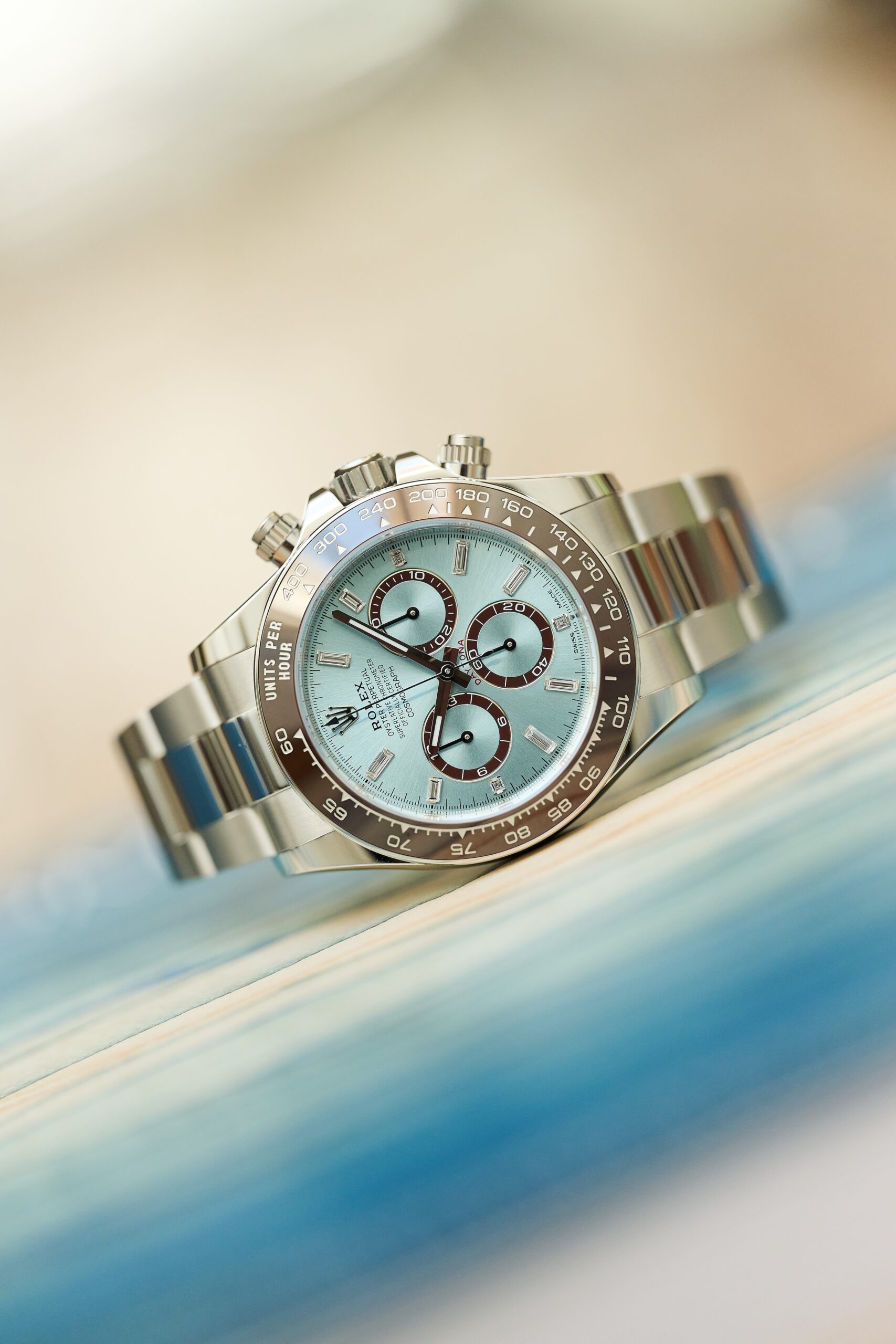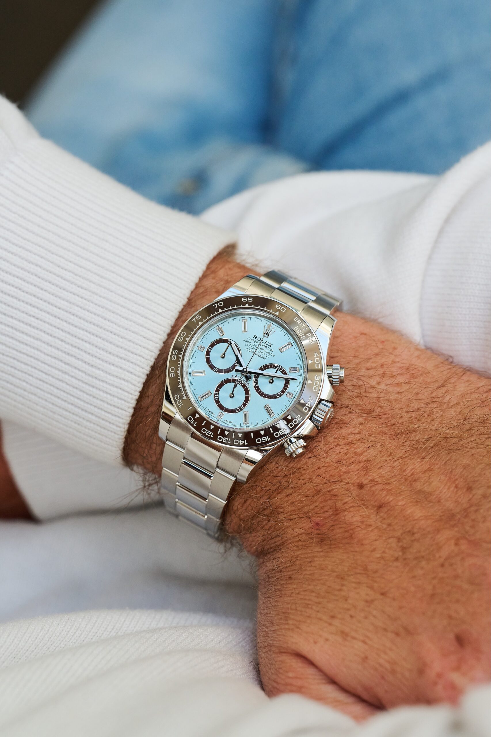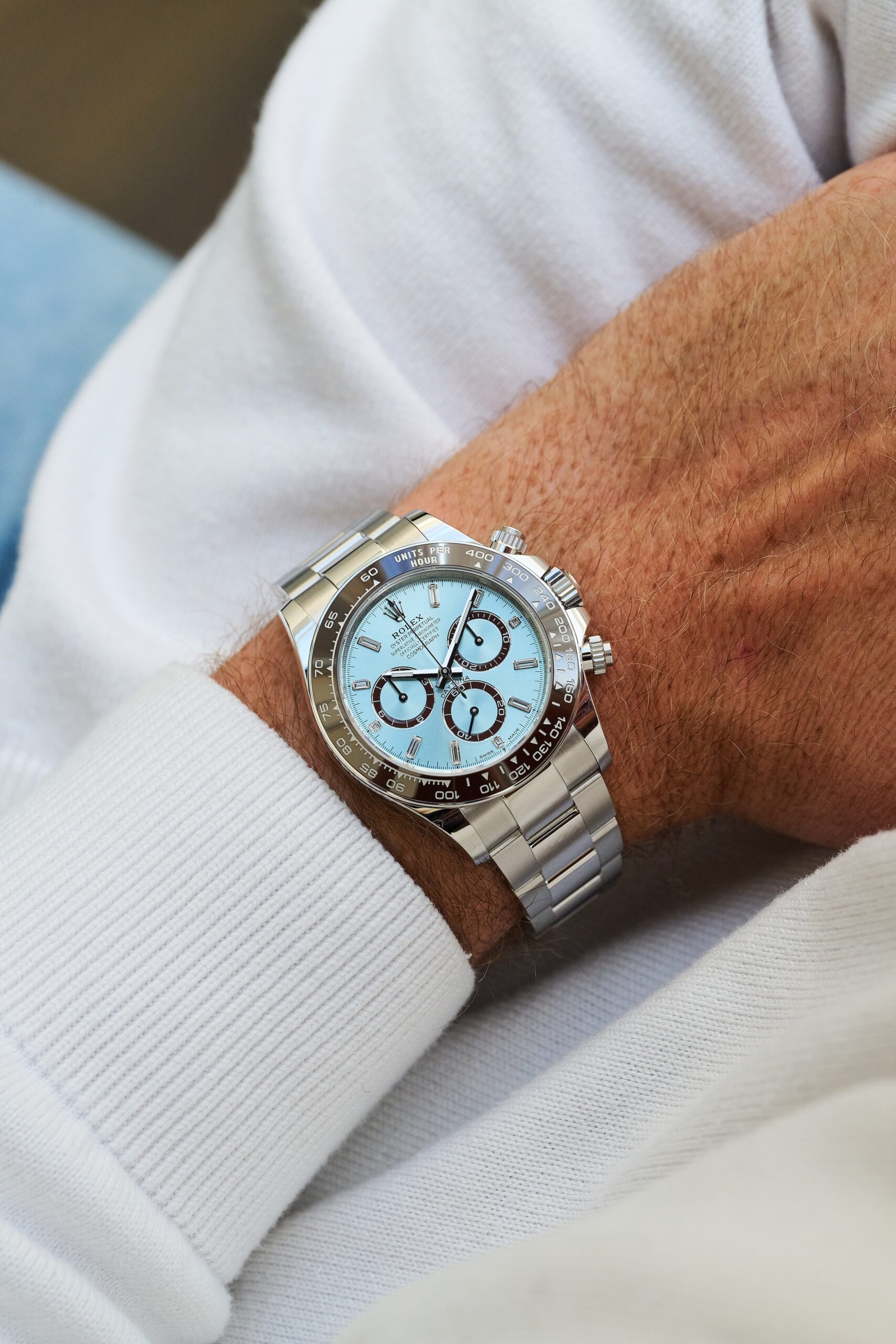 The 126506 sits at the very top of Rolex’s contemporary chronograph offering: a full-platinum Daytona with the signature ice-blue sunburst dial and chestnut-brown Cerachrom bezel. The baguette-diamond hour markers, however, give this reference a distinct personality. Rather than the standard lume-filled hour markers, the dial is framed by twelve razor-clean, perfectly matched diamond batons - jewellery-level finishing executed with Rolex’s usual precision and restraint. In natural light, they catch just enough brilliance to remind you this isn’t an ordinary Daytona.