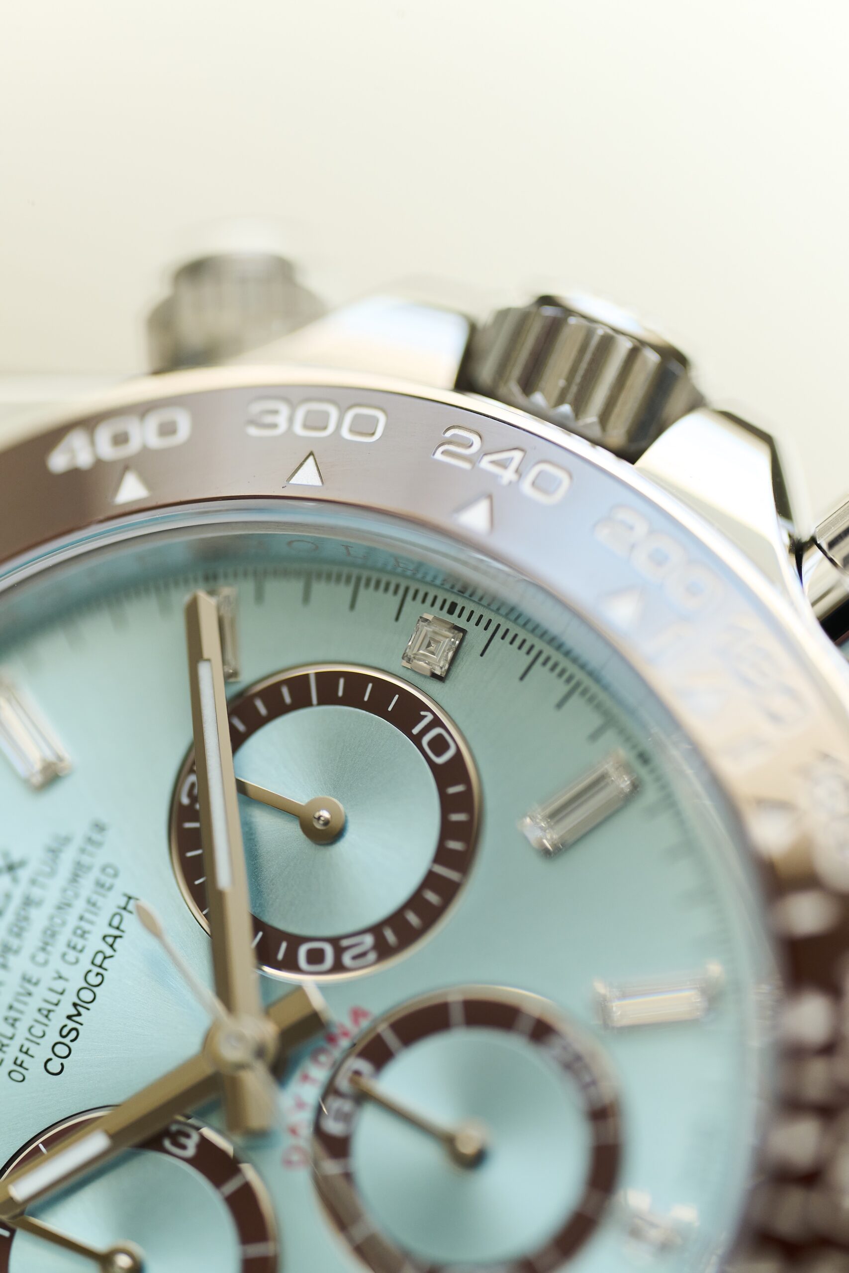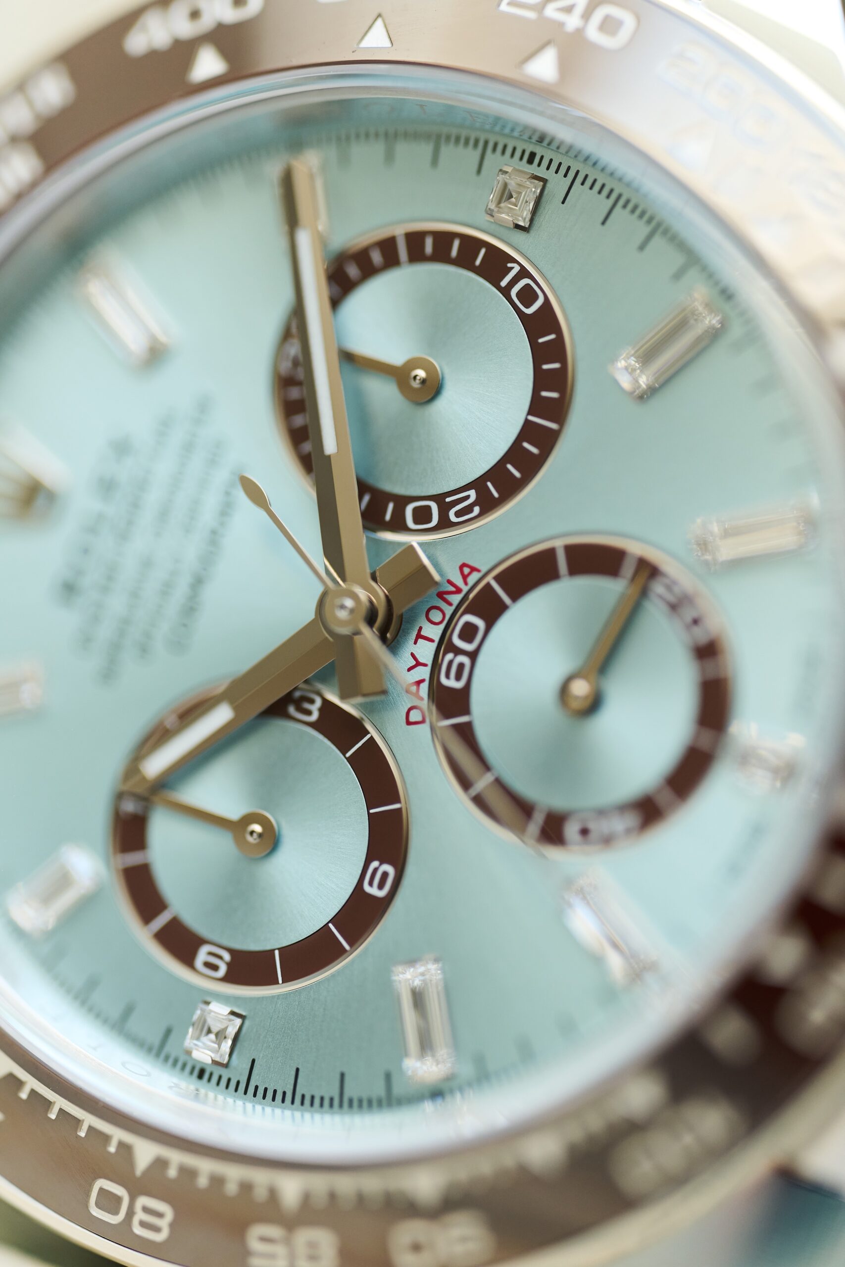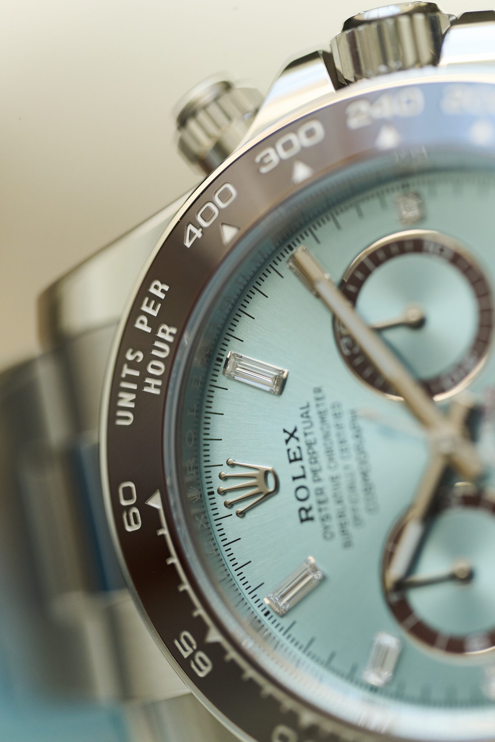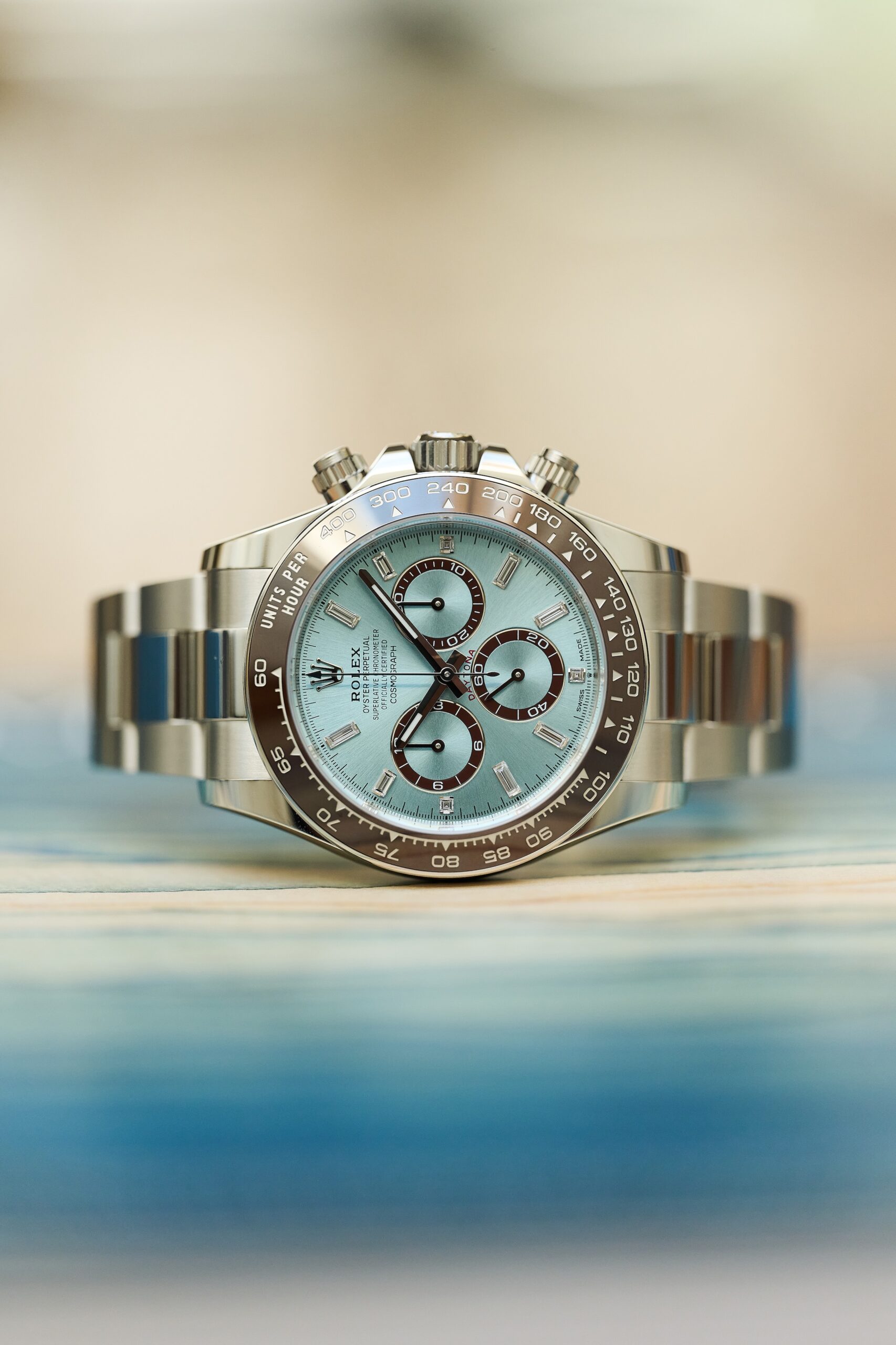 The 126506 sits at the very top of Rolex’s contemporary chronograph offering: a full-platinum Daytona with the signature ice-blue sunburst dial and chestnut-brown Cerachrom bezel. The baguette-diamond hour markers, however, give this reference a distinct personality. Rather than the standard lume-filled hour markers, the dial is framed by twelve razor-clean, perfectly matched diamond batons - jewellery-level finishing executed with Rolex’s usual precision and restraint. In natural light, they catch just enough brilliance to remind you this isn’t an ordinary Daytona.