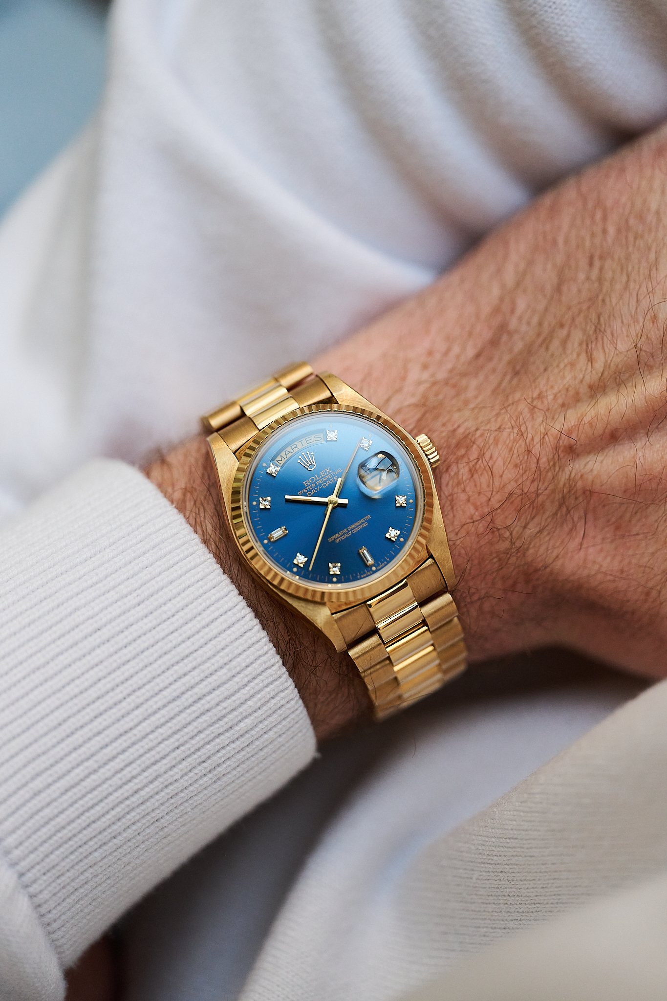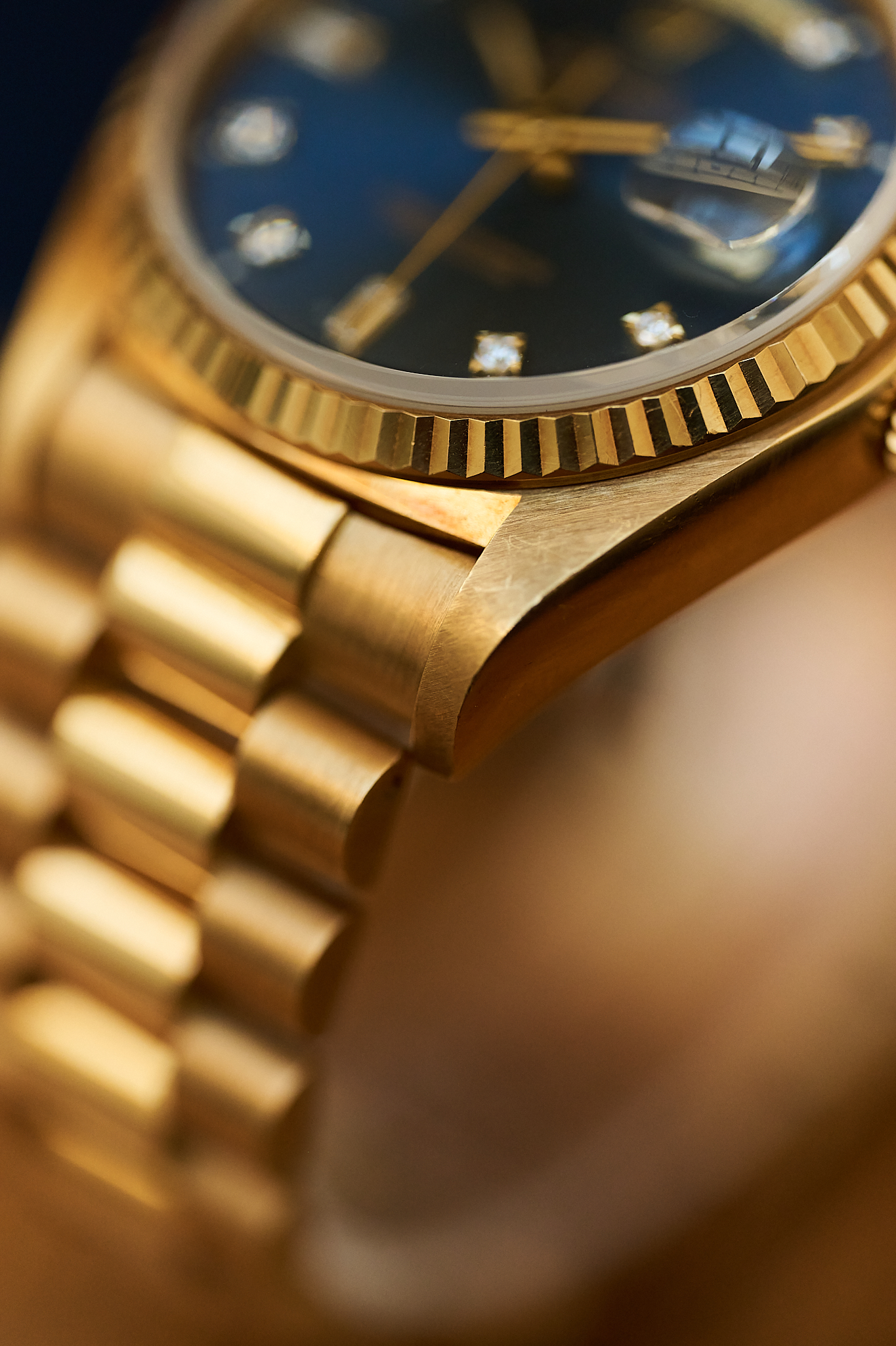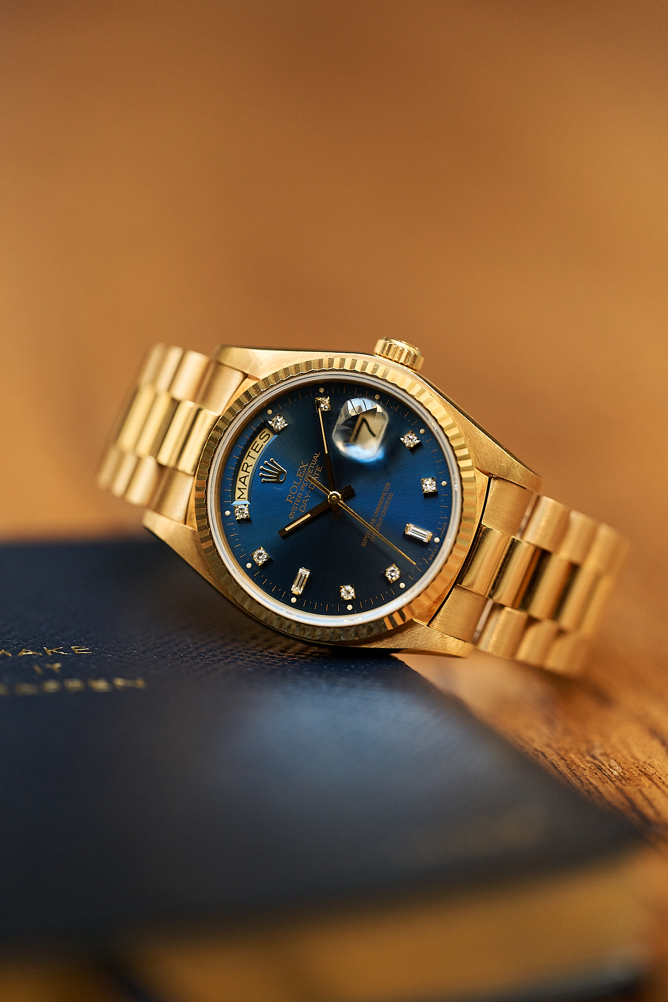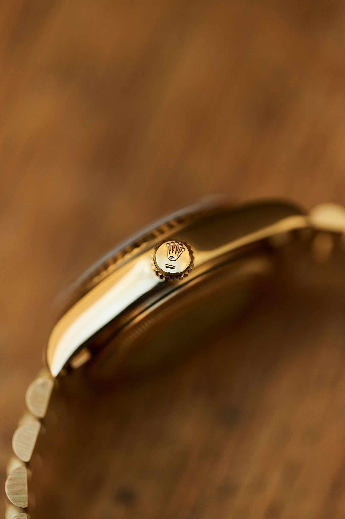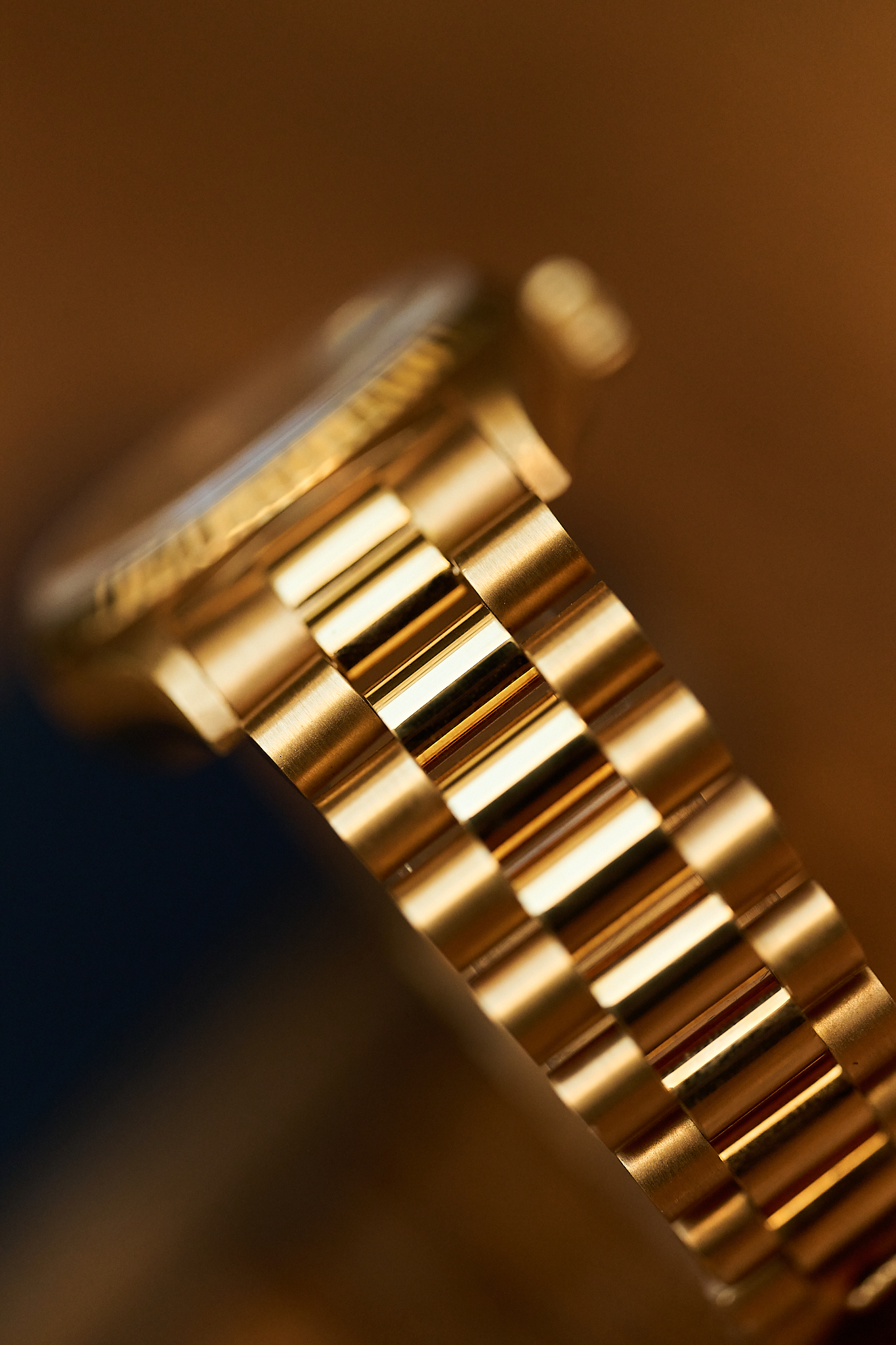 As a reference, the 18038 marks a pivotal moment in the Day-Date lineage - the first generation to introduce the sapphire crystal and the upgraded calibre 3055, bringing both improved reliability and a subtly more modern presence while still retaining all the warmth and charm of the four-digit Presidents. It’s the sweet spot between vintage character and everyday usability, which is exactly why collectors love it.