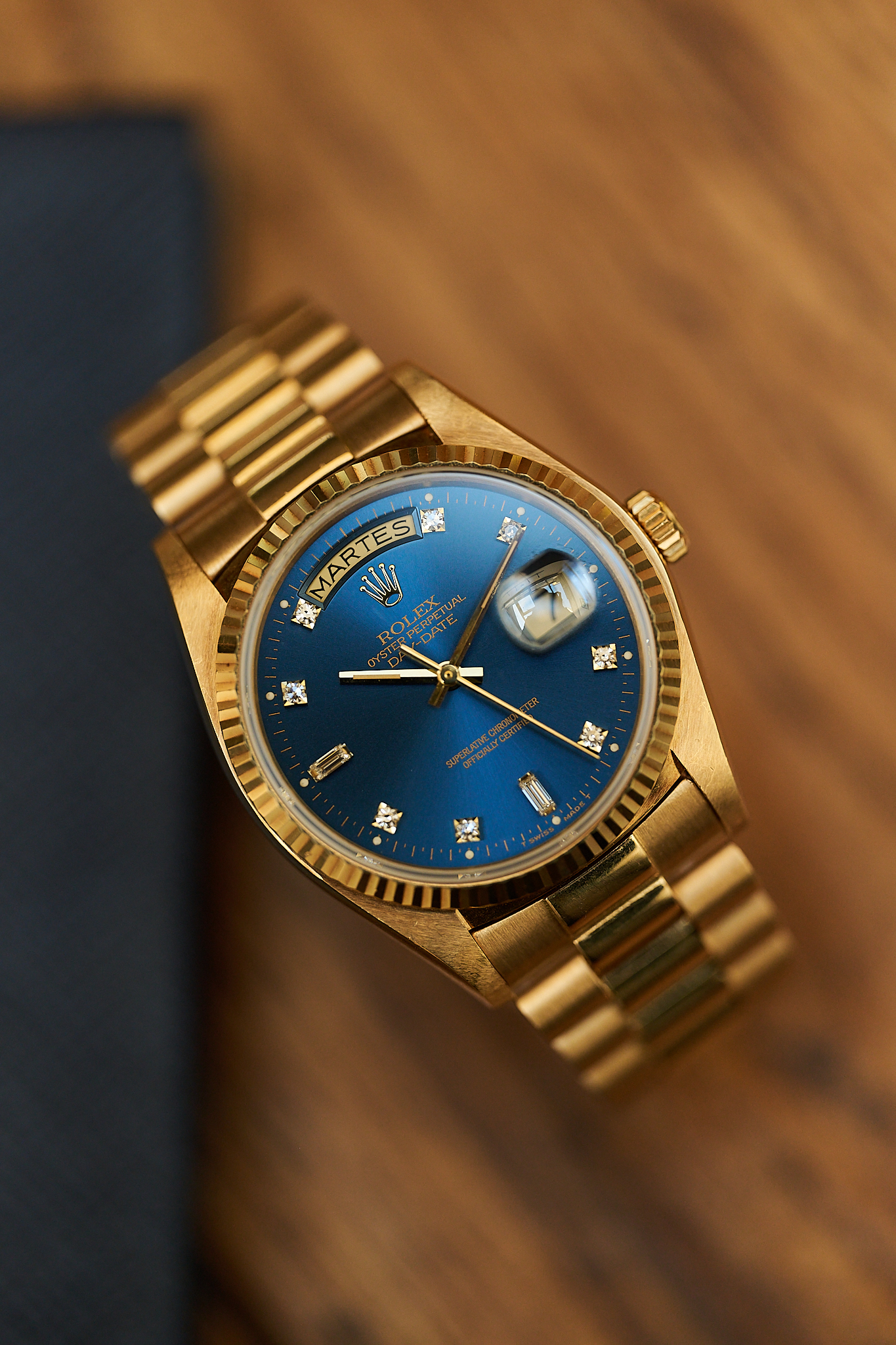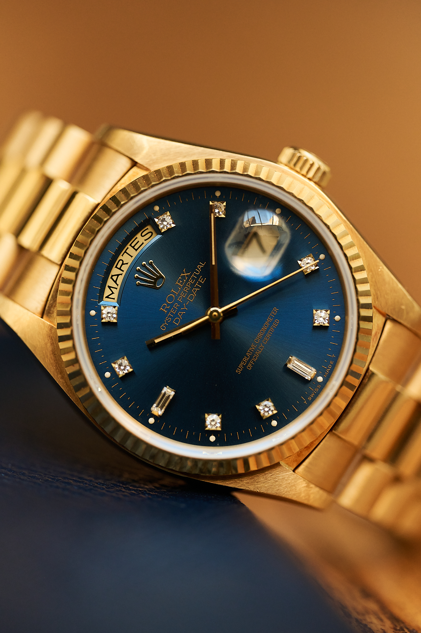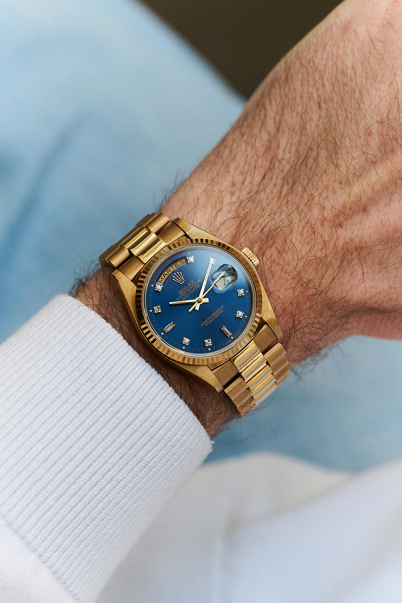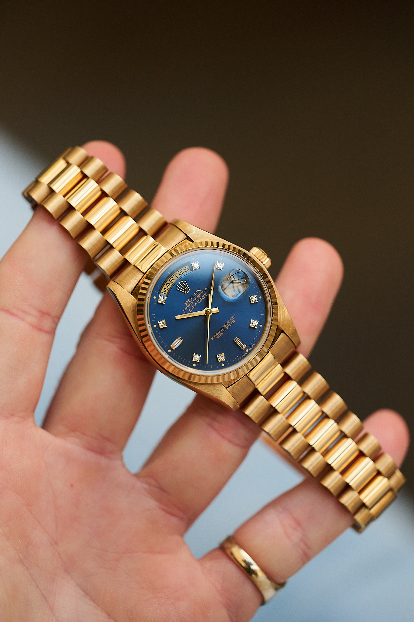 As a reference, the 18038 marks a pivotal moment in the Day-Date lineage - the first generation to introduce the sapphire crystal and the upgraded calibre 3055, bringing both improved reliability and a subtly more modern presence while still retaining all the warmth and charm of the four-digit Presidents. It’s the sweet spot between vintage character and everyday usability, which is exactly why collectors love it.