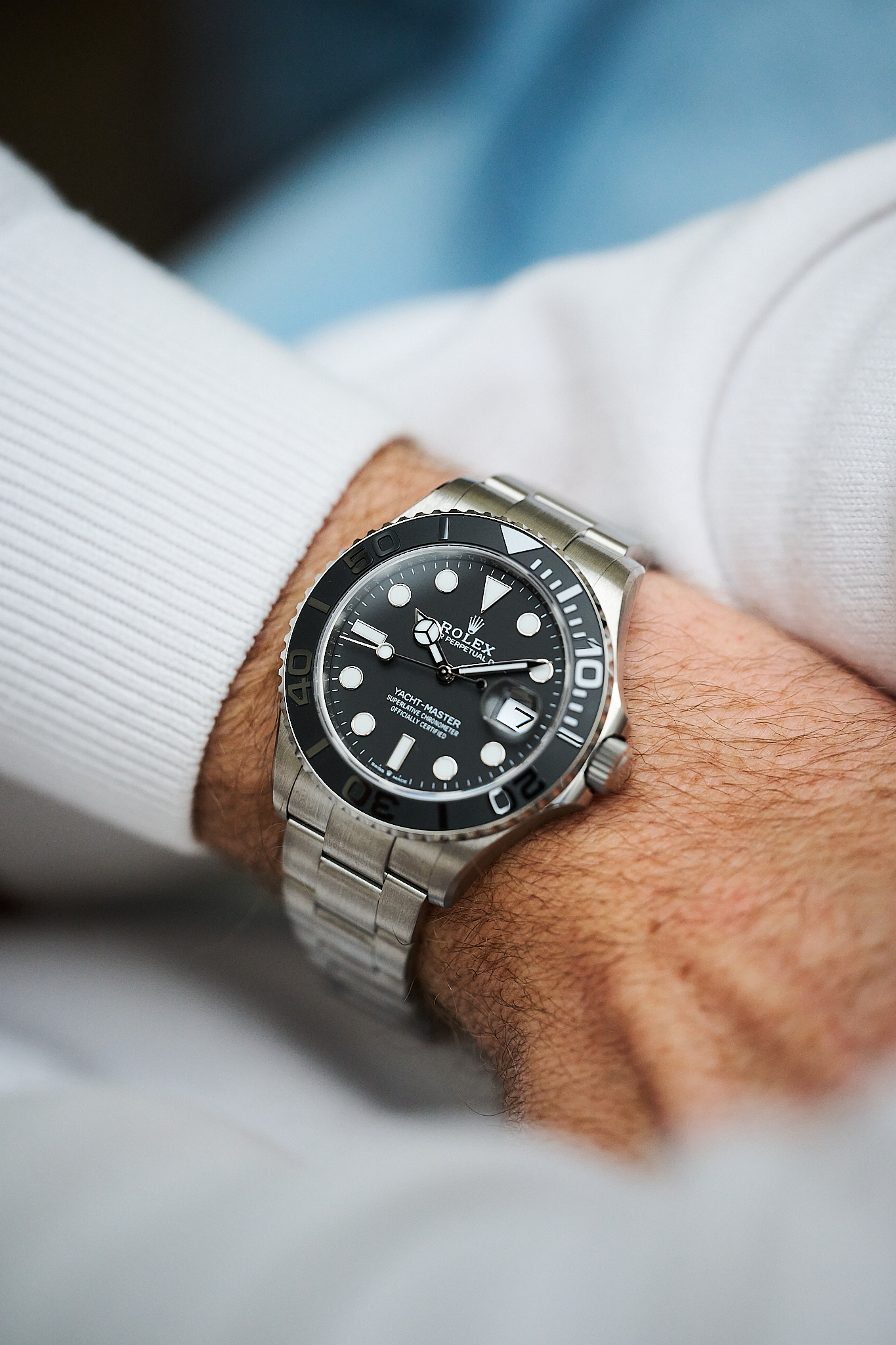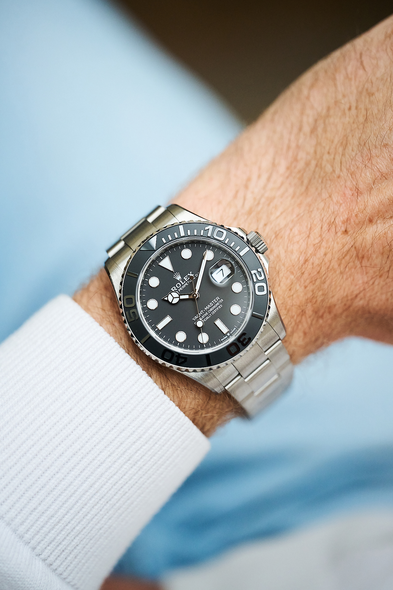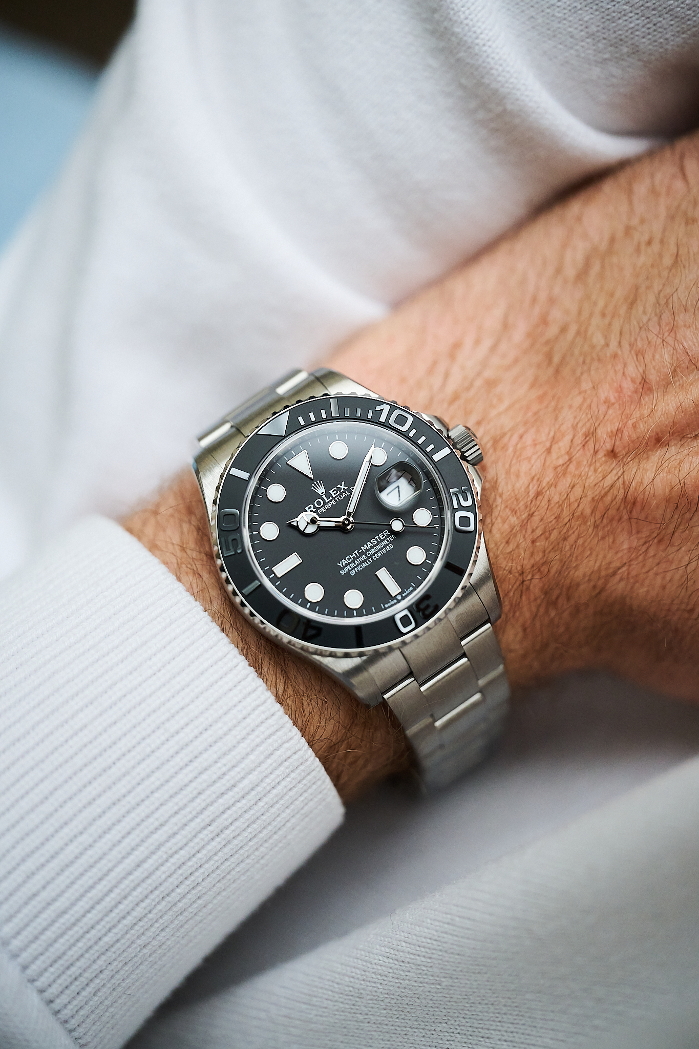 First unveiled in 2023, the 226627 marked a bold step for Rolex, introducing titanium for the very first time in the Yacht-Master collection. The result is a watch that feels strikingly light on the wrist yet remains unmistakably robust, with a matte, satin-brushed finish that gives it a purposeful, almost tool-like character. At 42mm, the proportions are balanced perfectly by the softly curved lugs and bi-directional bezel fitted with a matte black Cerachrom insert.