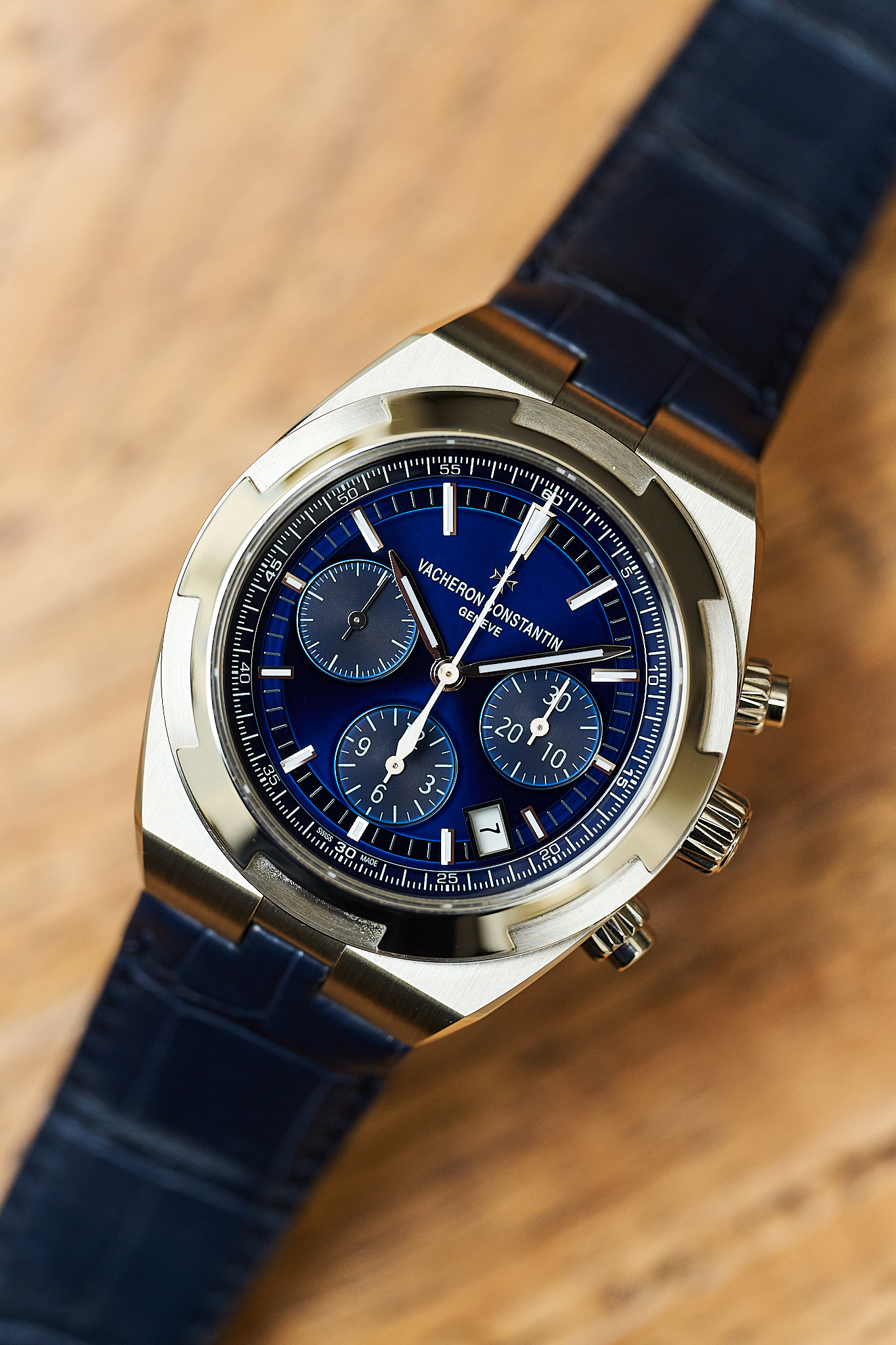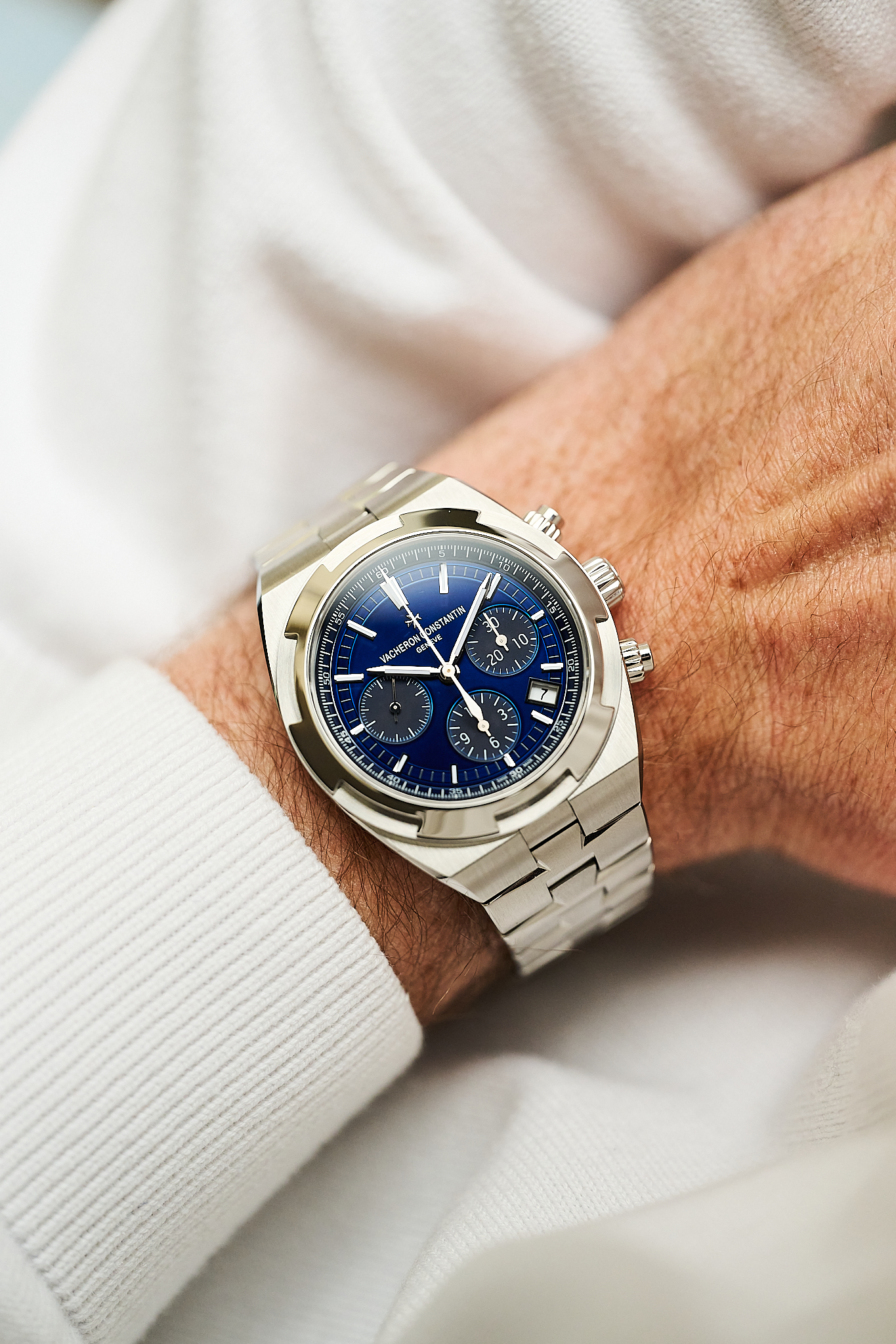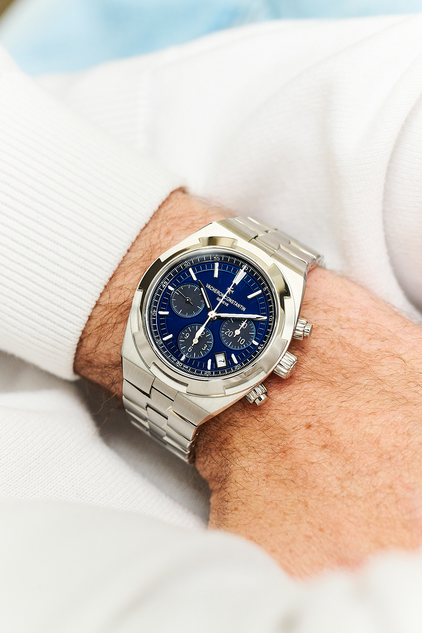 A modern sports chronograph that seamlessly blends refinement with functionality, the Overseas is defined by its sharp, architectural case lines, beautifully balanced tri-compax layout, and exceptional wearability on the wrist.