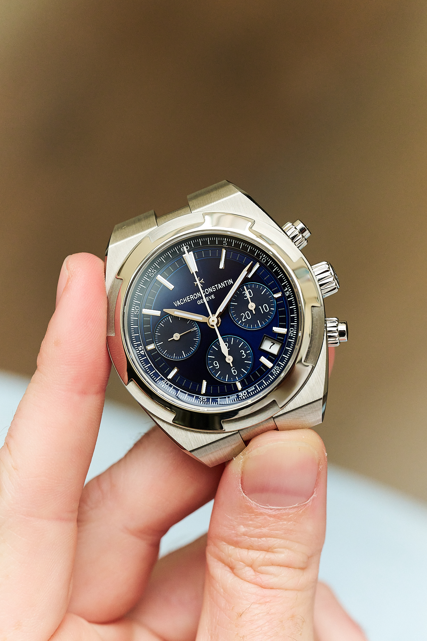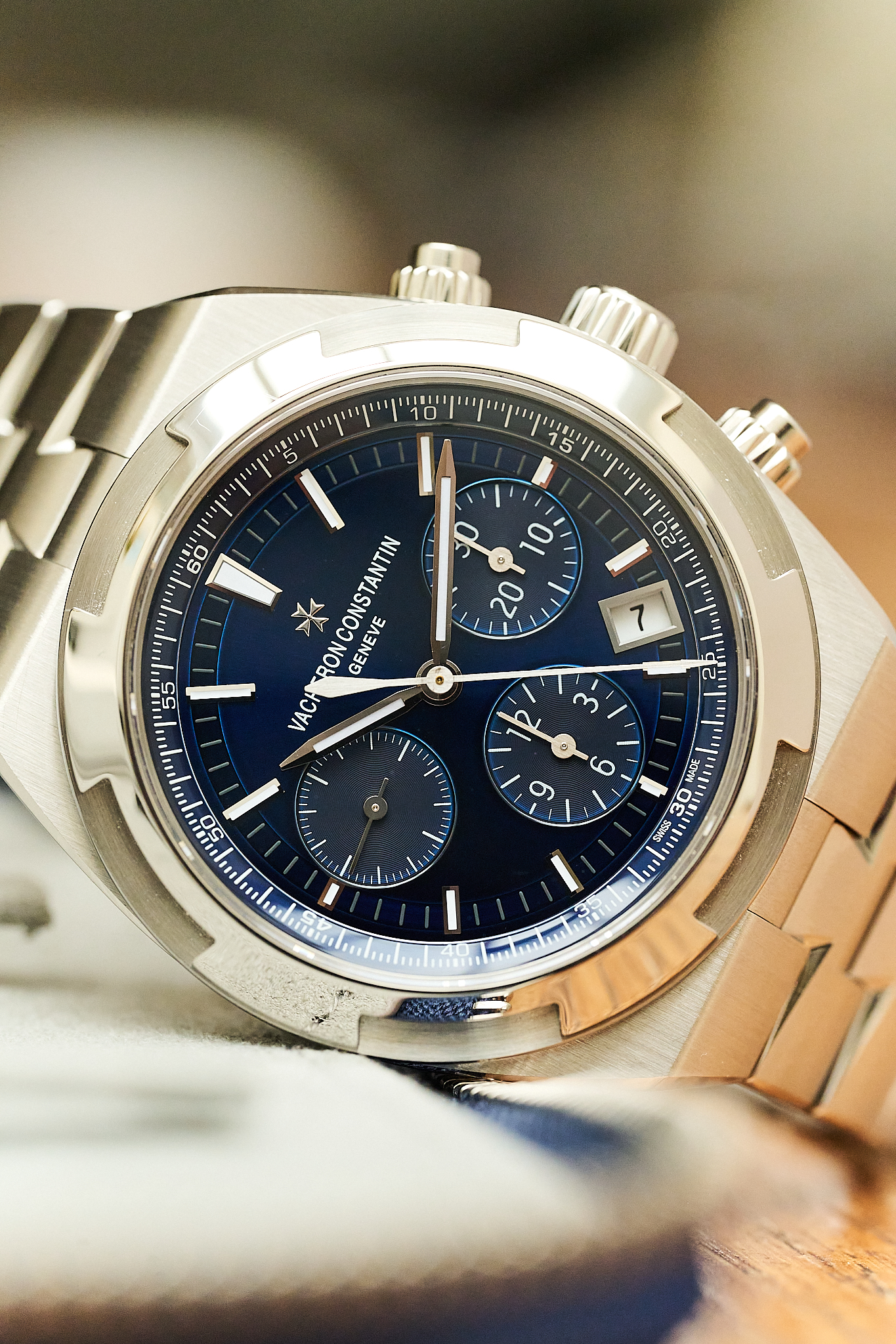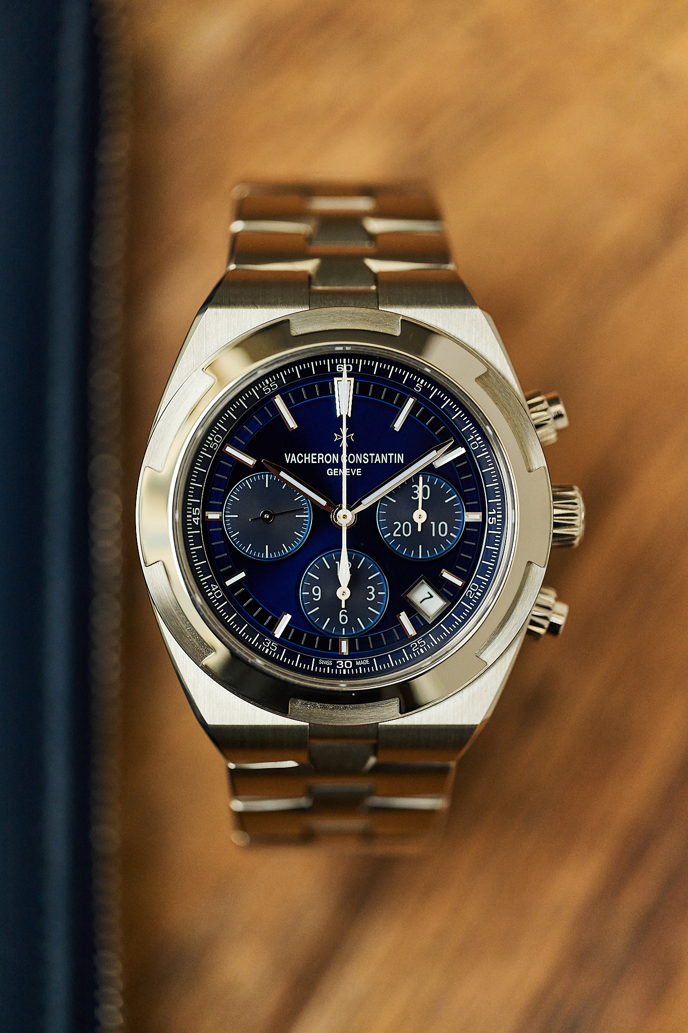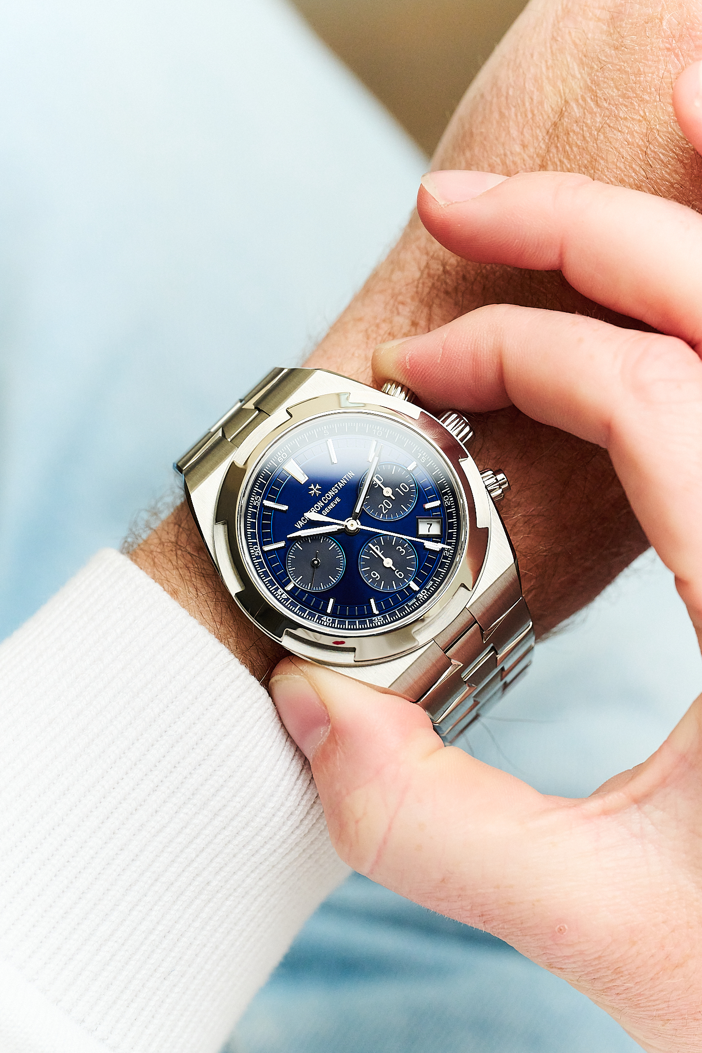A modern sports chronograph that seamlessly blends refinement with functionality, the Overseas is defined by its sharp, architectural case lines, beautifully balanced tri-compax layout, and exceptional wearability on the wrist.
